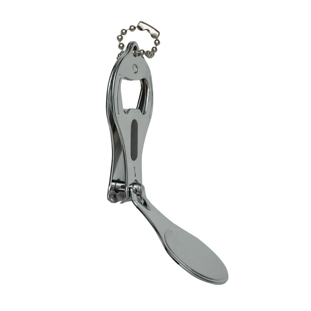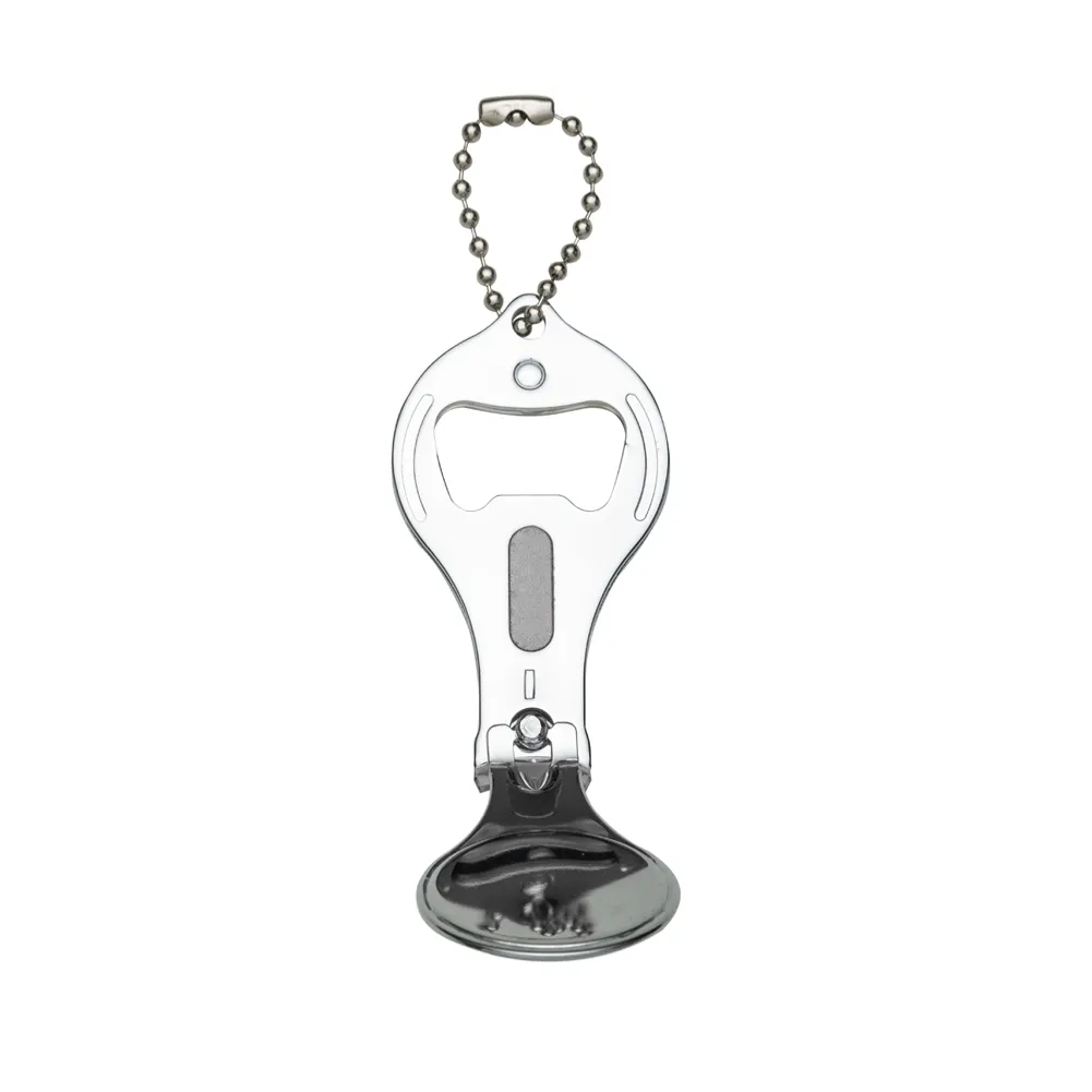 Chaveiro metal 3 em 1: abridor, cortador e lixa. Parte central circular ideal para gravações, detalhe de traços no contorno circular. Lado frontal com detalhes em relevo nas laterais e pequeno círculo acima do abridor. Para utilizar o cortador basta rotacionar a peça cirular e levantá-la. Acompanha correntinha.