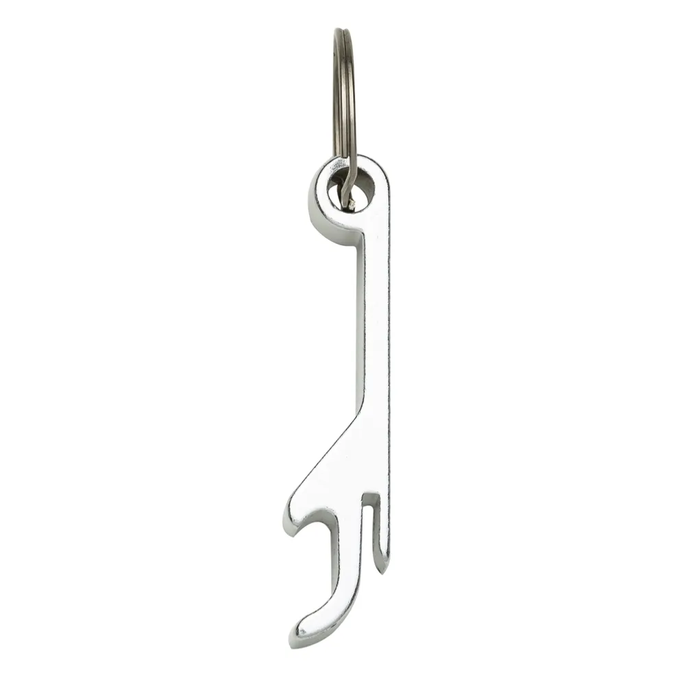 Chaveiro abridor de metal formato “pé de galinha”.