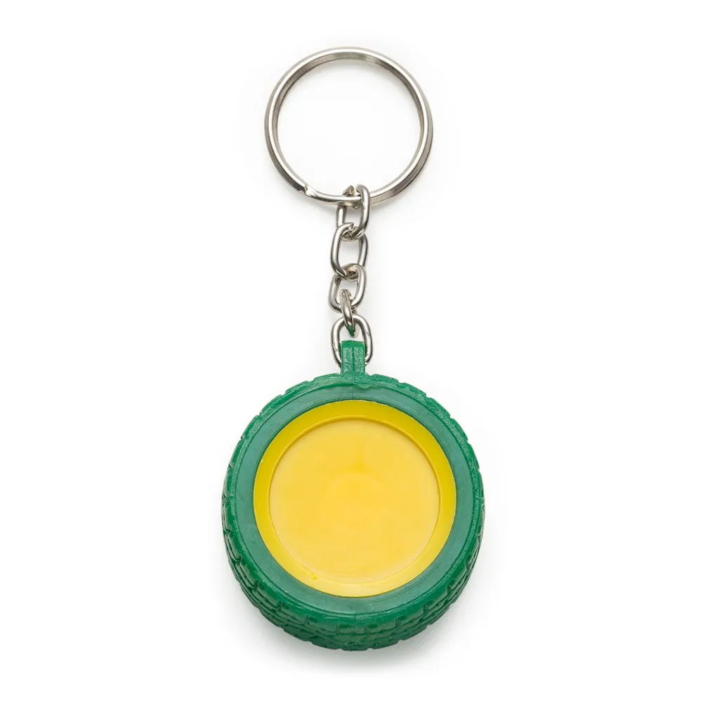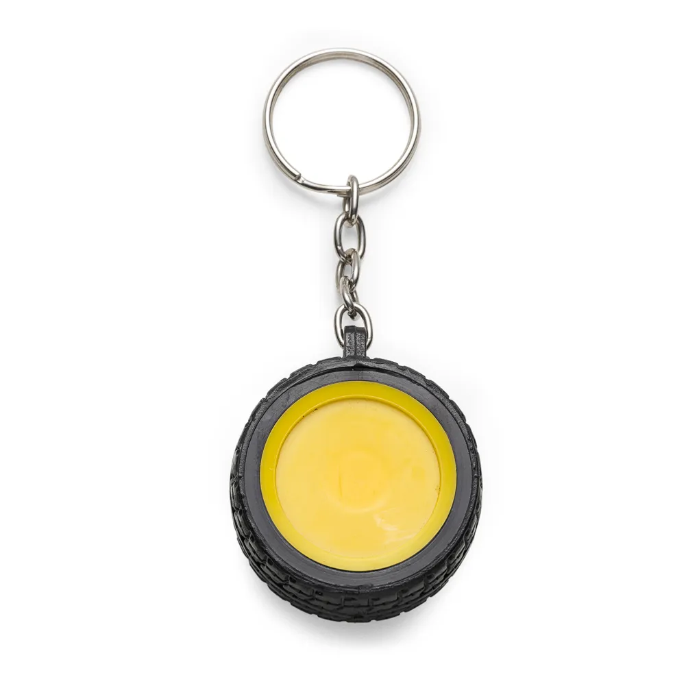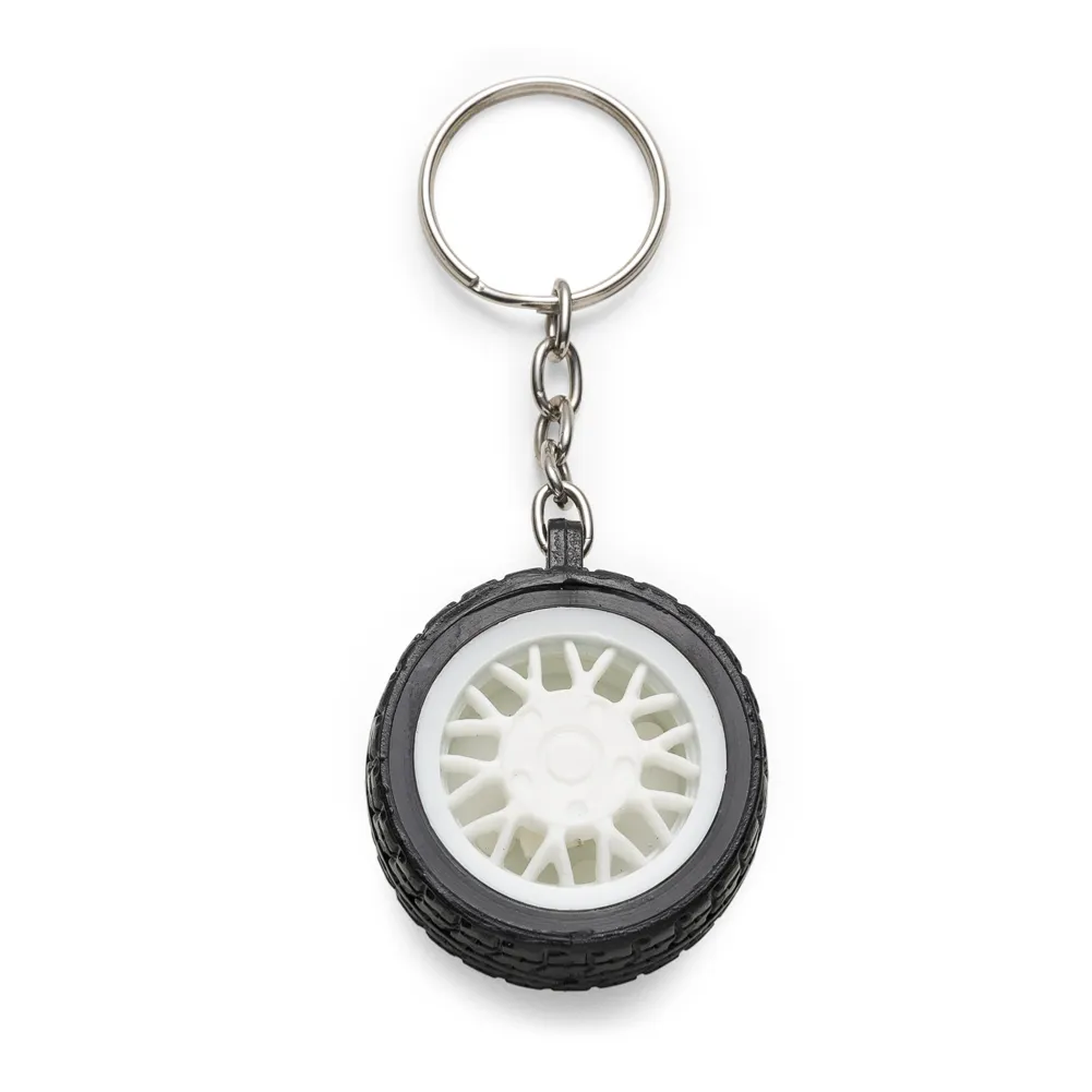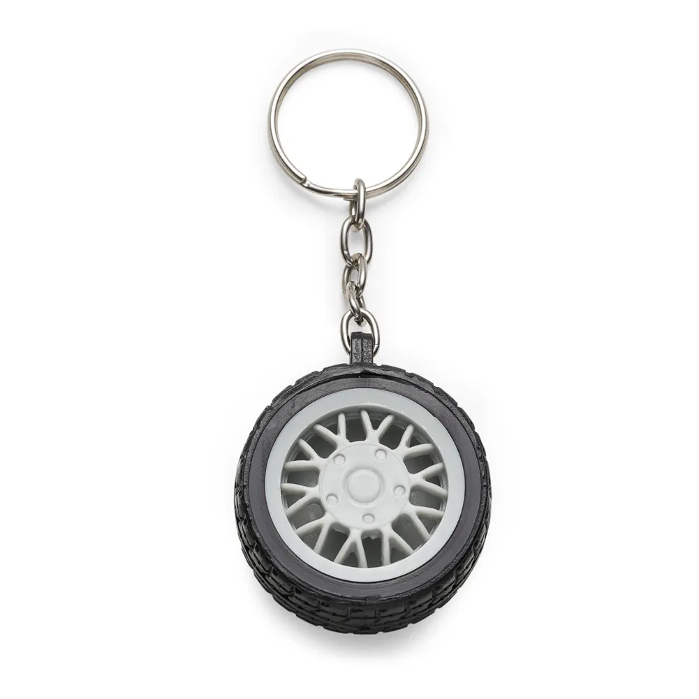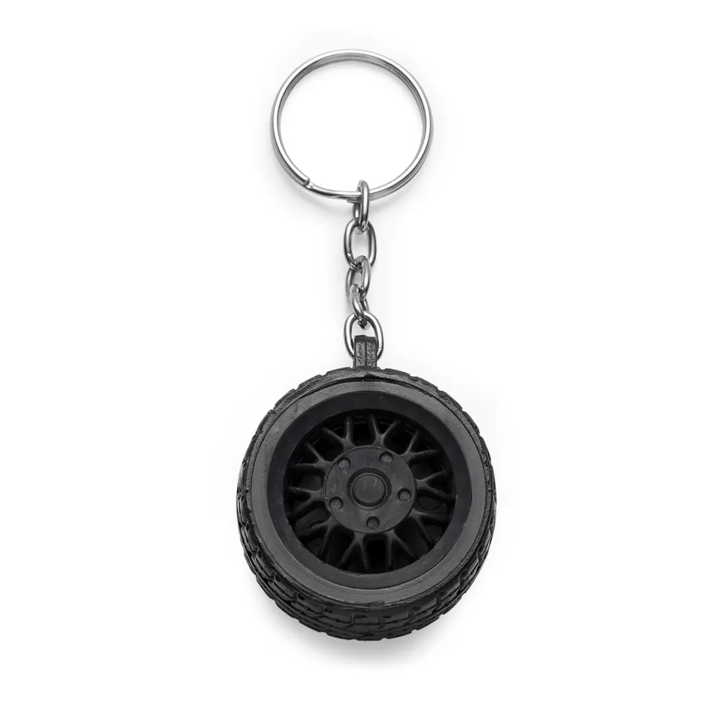 Chaveiro plástico formato pneu, aro detalhado plástico colorido de um lado e lado inverso liso(possível aplicar resina). Pneu emborrachado.