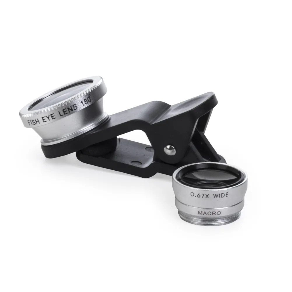 Conjunto universal de lentes para celular. Possui lente fish eye, lente macro, lente wide angle e prendedor Basta rosquear as lentes no prendedor e posicioná-lo na câmera do celular para seu funcionamento. Acompanha veludo para guardar os itens.
