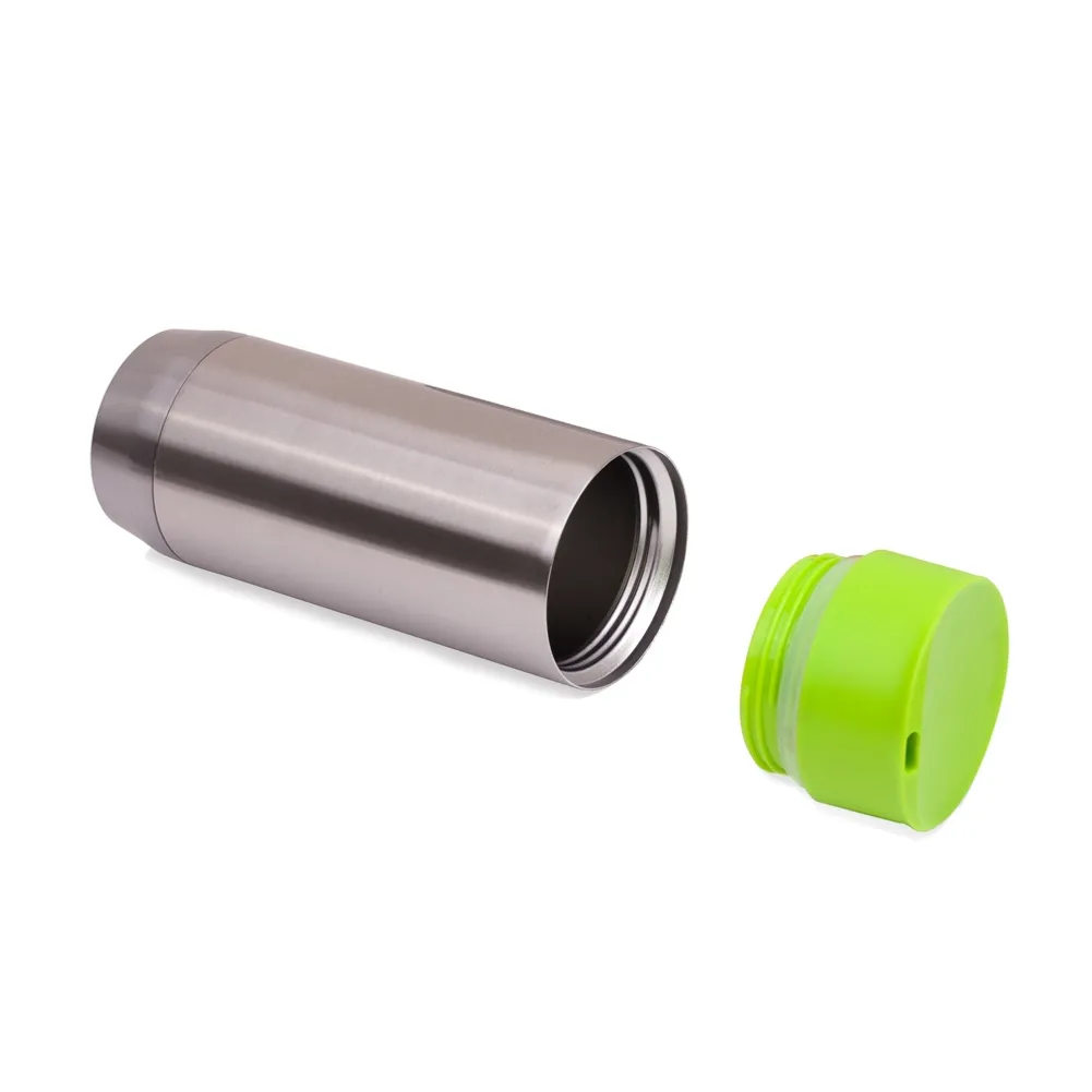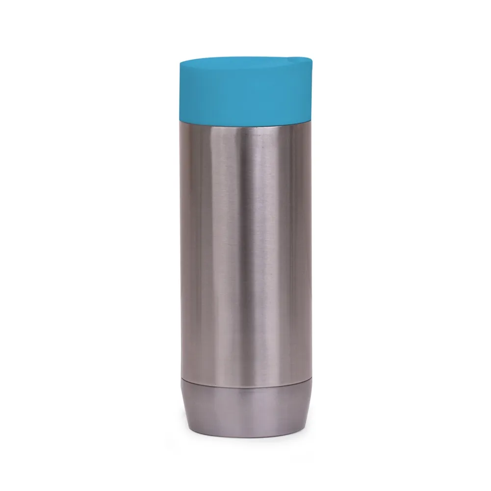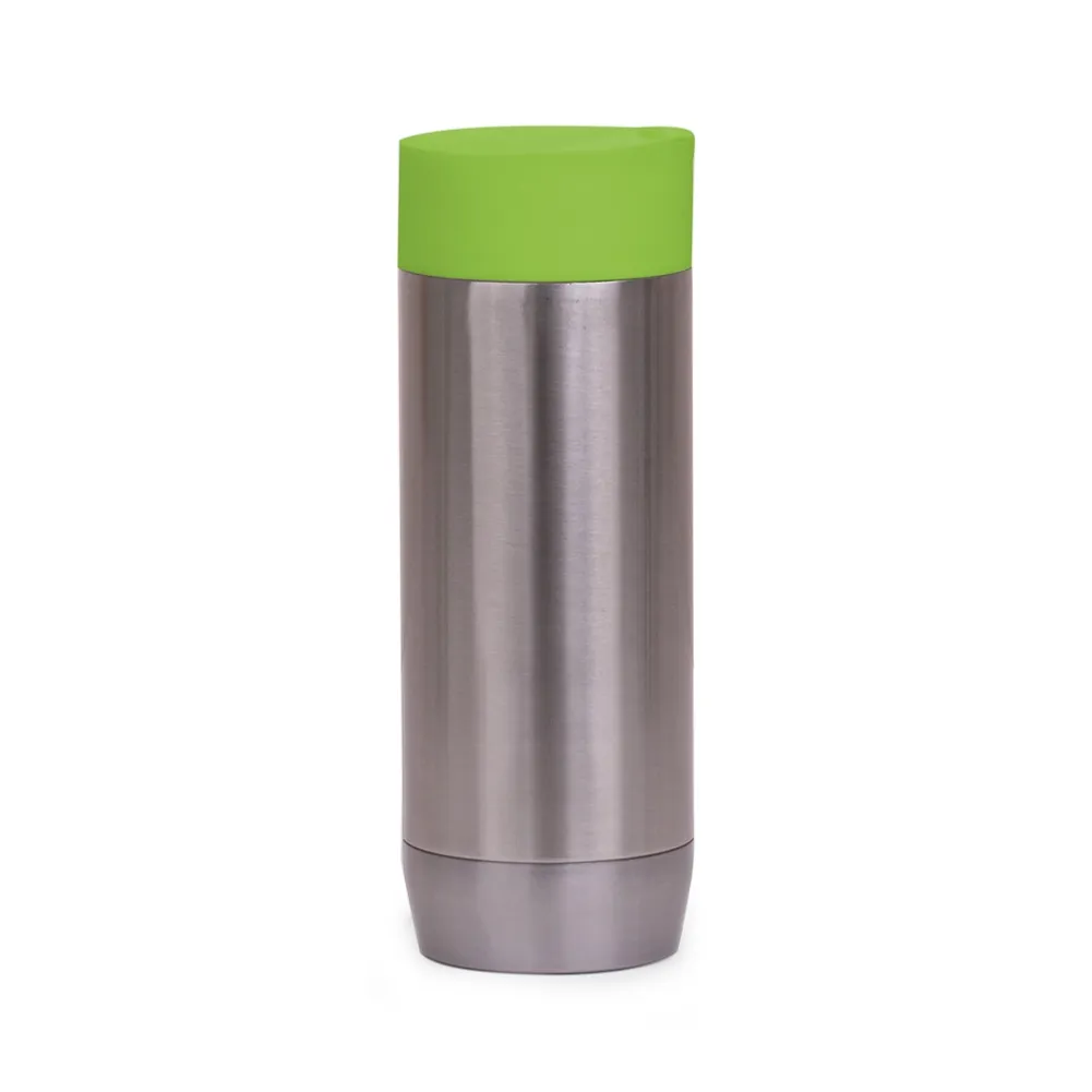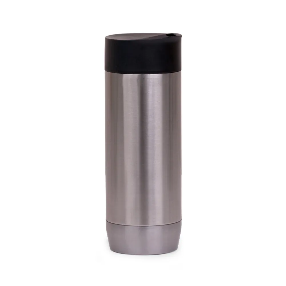 Copo inox 420ml com tampa rosqueável e parede dupla. Tampa plástica com abertura para bocal e botão acionador para liberação da passagem de líquido. Obs.: Conserva temperatura.