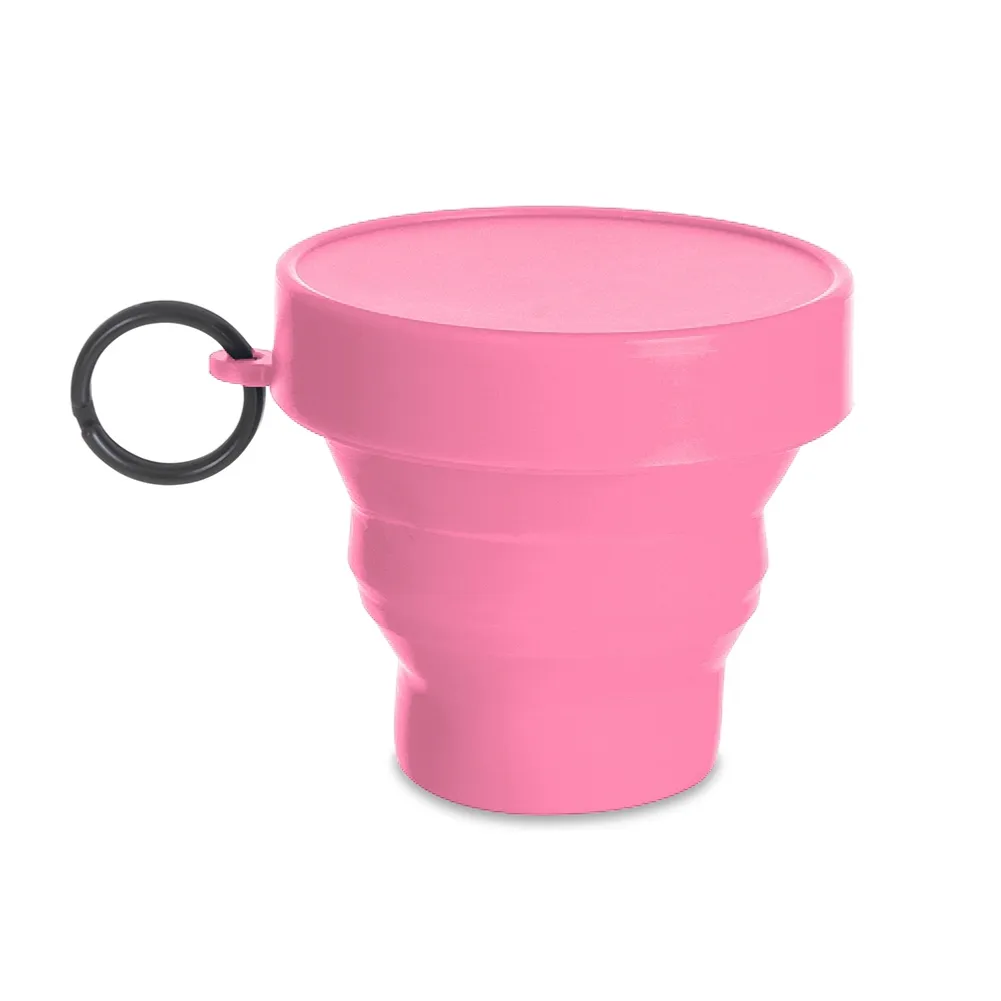Copo retrátil 150ml de borracha termoplástica, possui tampa de encaixe com argola plástica.