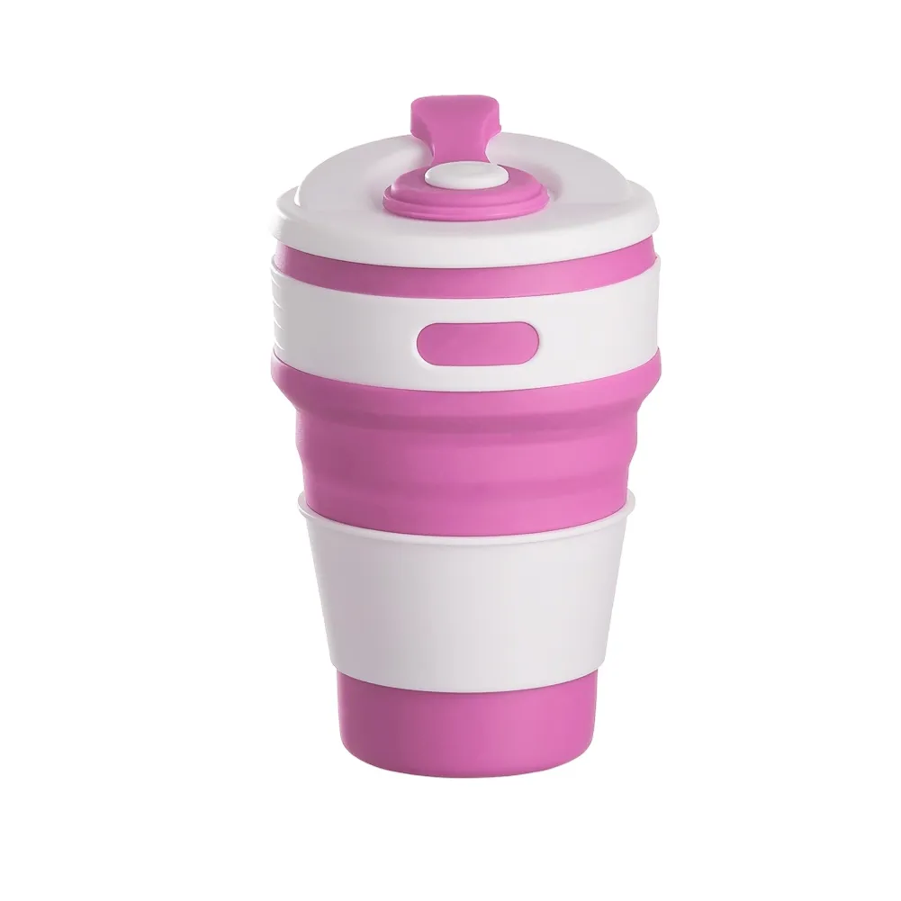 Copo retrátil 350ml de silicone, livre de BPA. Tampa plástica de encaixe com abertura para o bocal, acompanha "luva" plástica branca, evitando queimar as mãos com líquido quente.