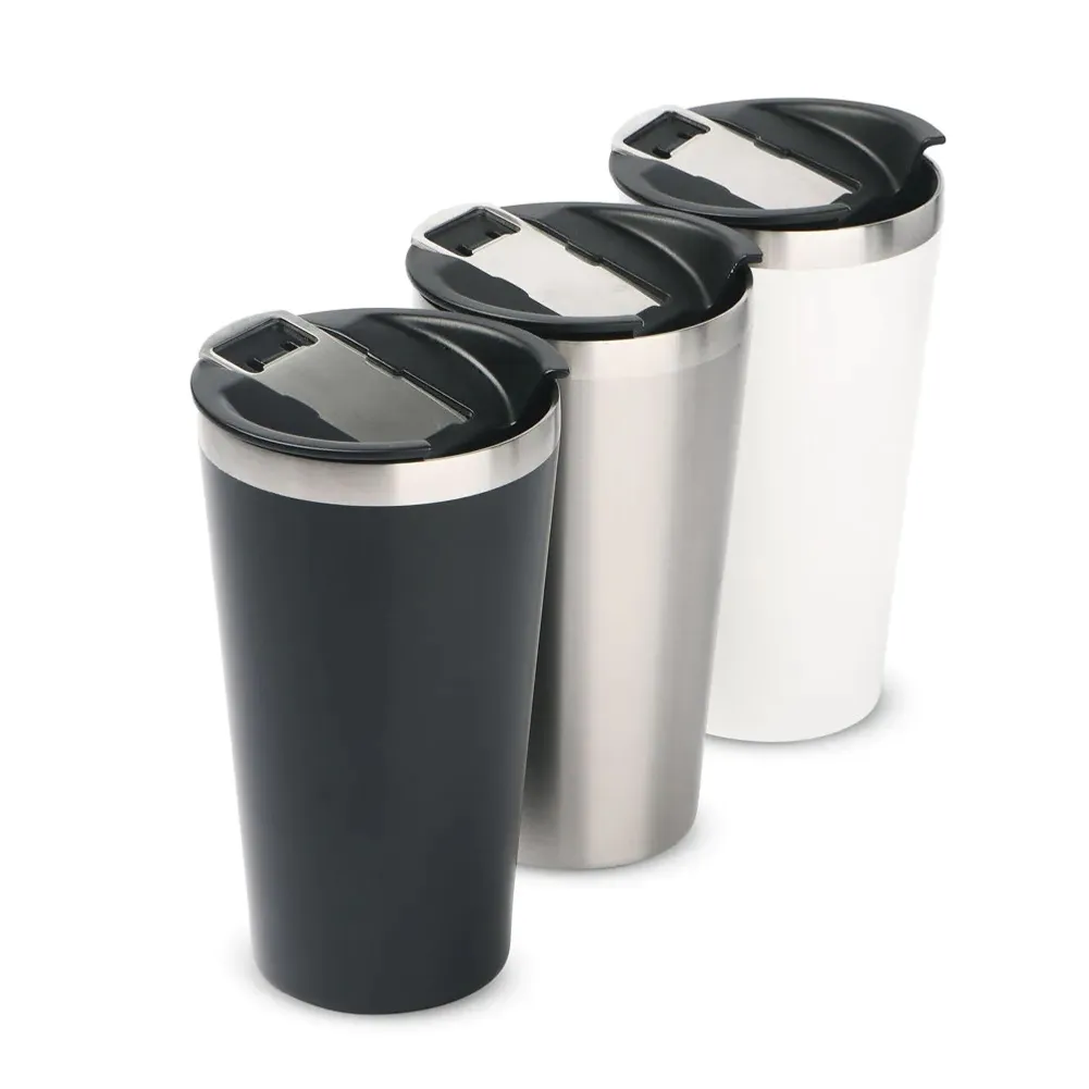 Copo térmico em aço inox com parede dupla, detalhe em aço escovado, tampa plástica com anel de silicone para vedação com abridor de garrafas em inox. Capacidade 500ml, pintura fosca.