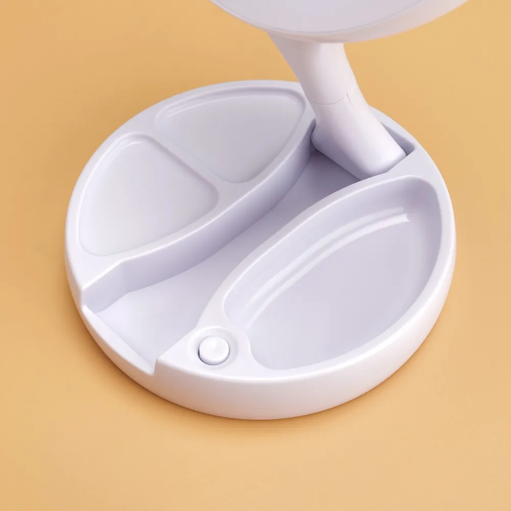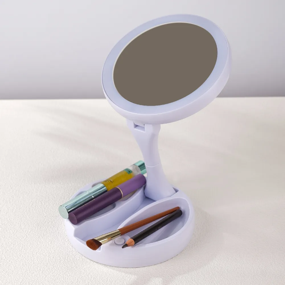 Espelho Dobrável com LED Recarregável e dupla face, material plástico. O espelho possui uma das faces ampliada 10x e do outro lado, espelho convencional 1x, iluminação LED dos dois lados, três compartimentos na base para armazenamento de acessórios, espelho giratório e regulável, botão liga/desliga e botão para acionar a iluminação, com funcionamento à base de 4 pilhas AA ou via cabo USB. Acompanha antiderrapantes emborrachados.