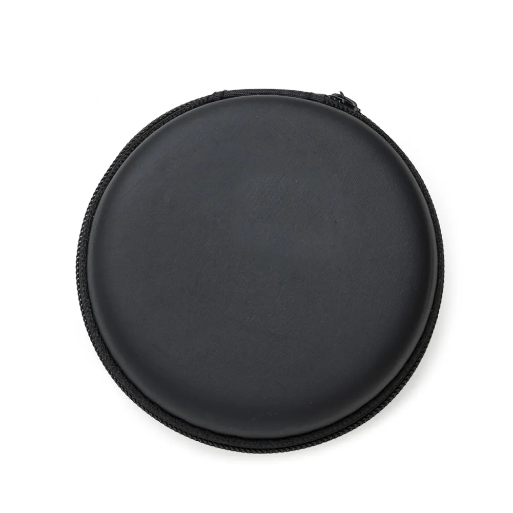 Estojo redondo de material emborrachado fosco. Parte interna com rede de nylon, ideial para montar um kit tecnológico.