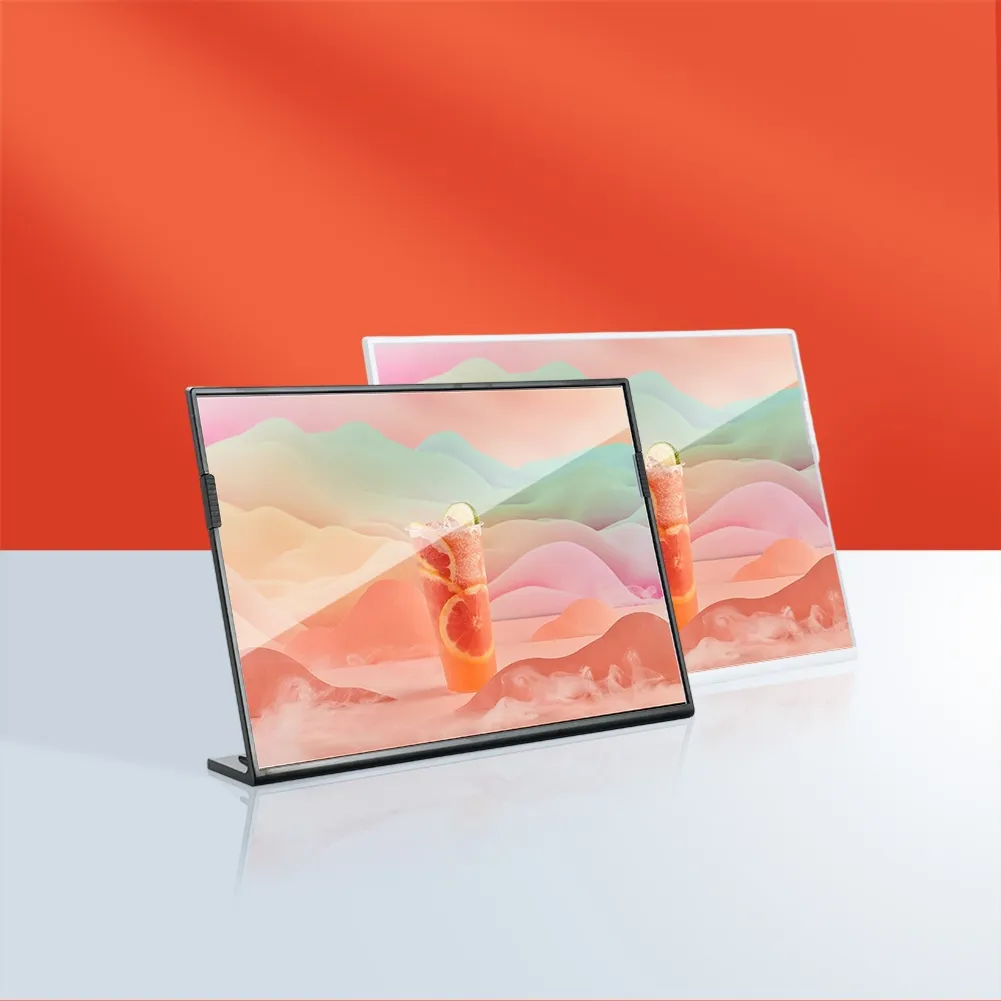 Expositor porta retrato A4 feito em poliestireno com placa acrílica.