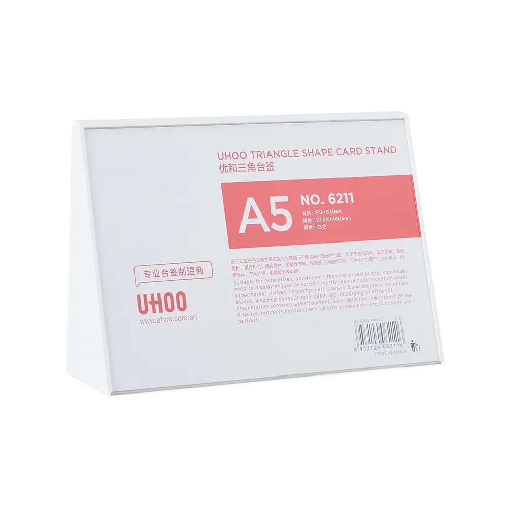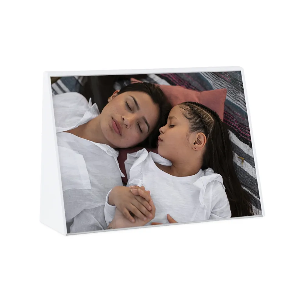 Expositor porta retrato A5 feito em poliestireno com placa acrílica.