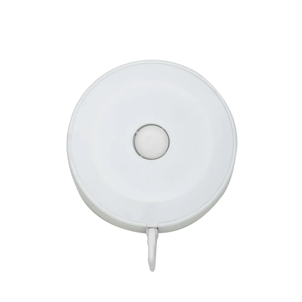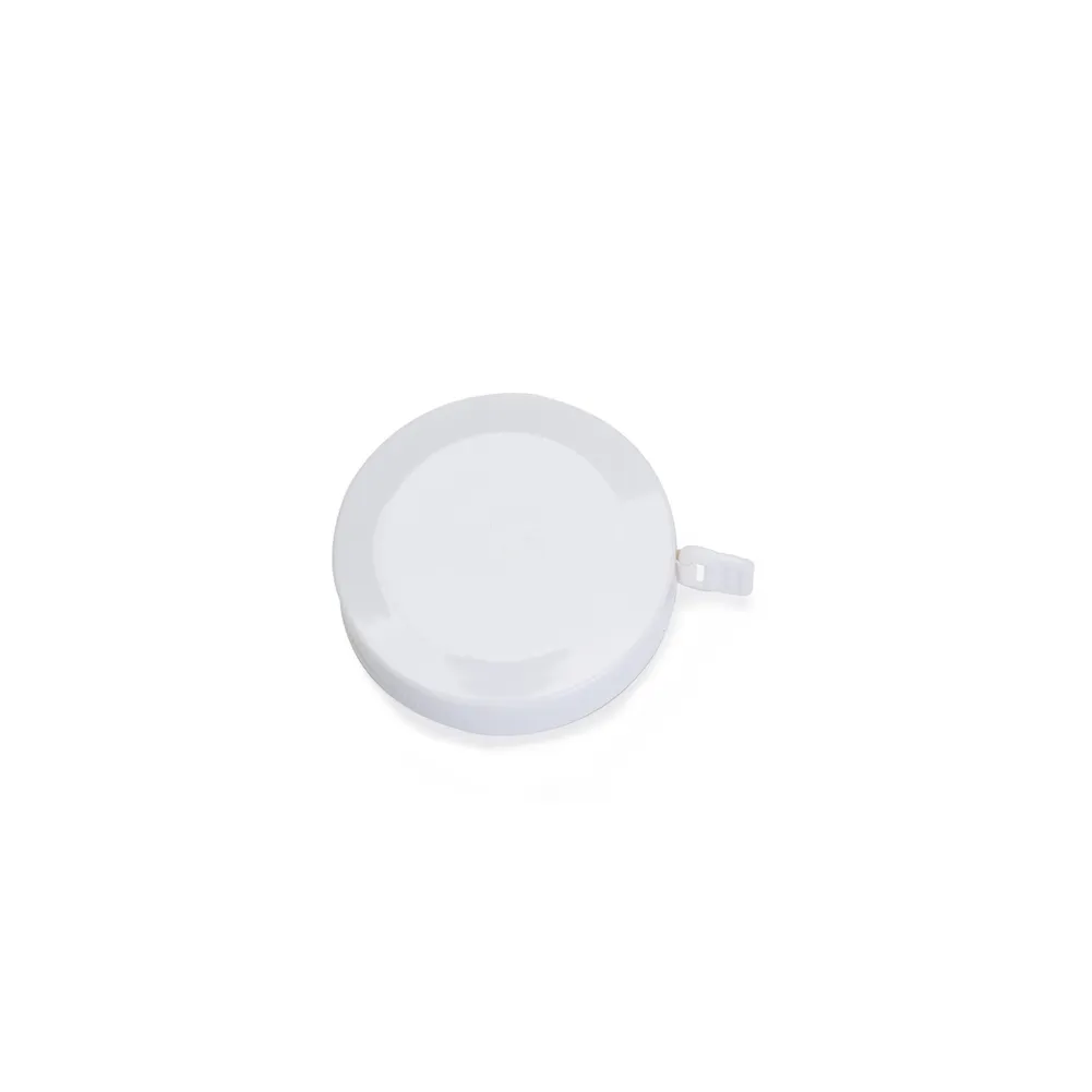 Fita métrica plástica redonda de 1,50m. Possui relevo na lateral, verso central liso e lado oposto com botão para travar/destravar.