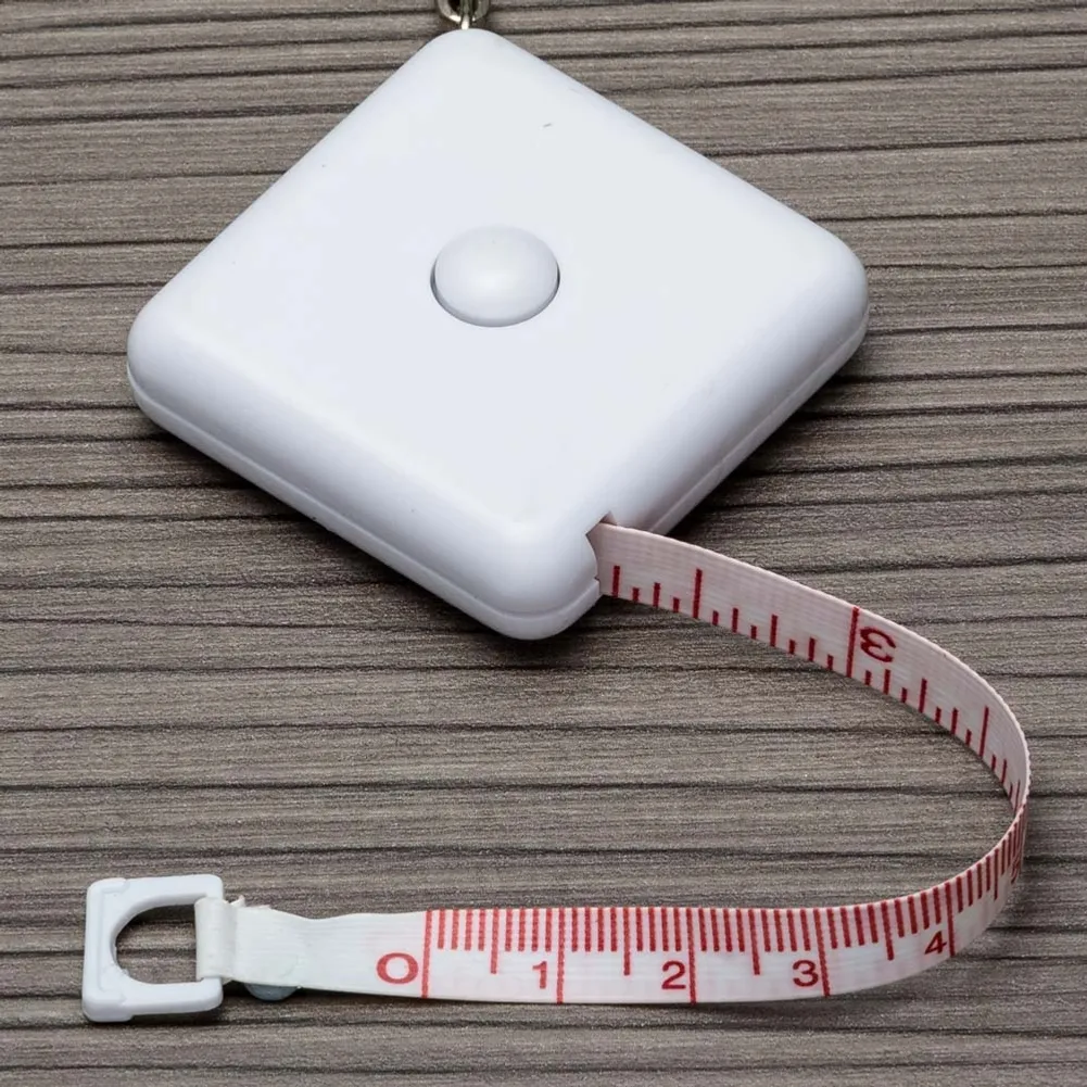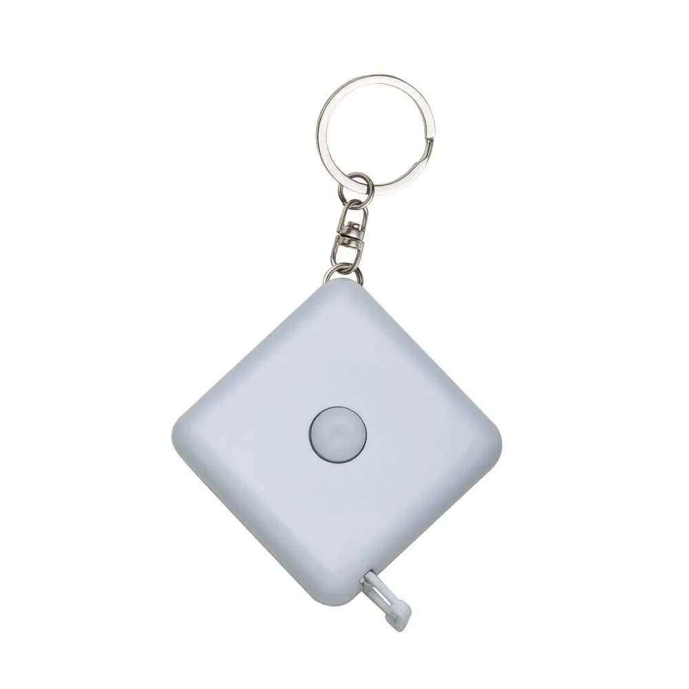 Fita métrica de 1 metro em plástico quadrangular, frente lisa e verso com botão (trava). Acompanha chaveiro.