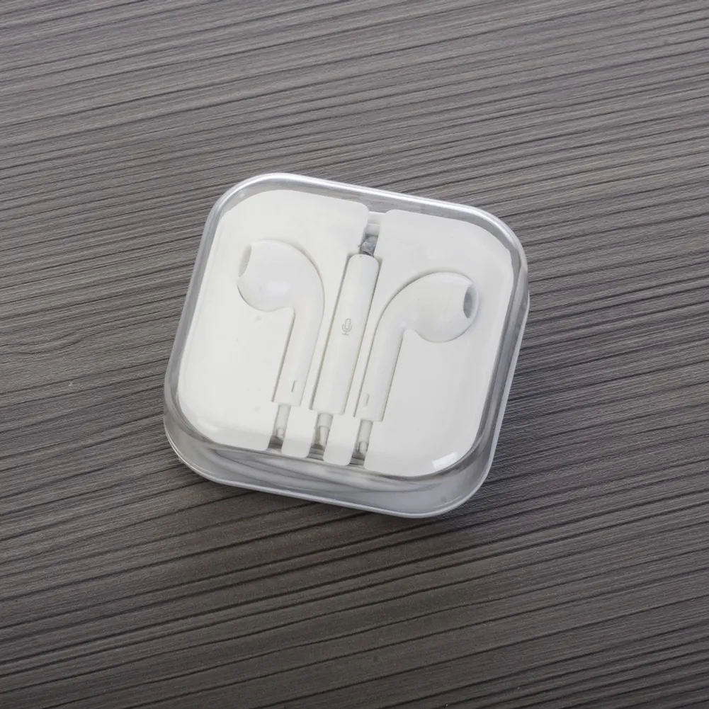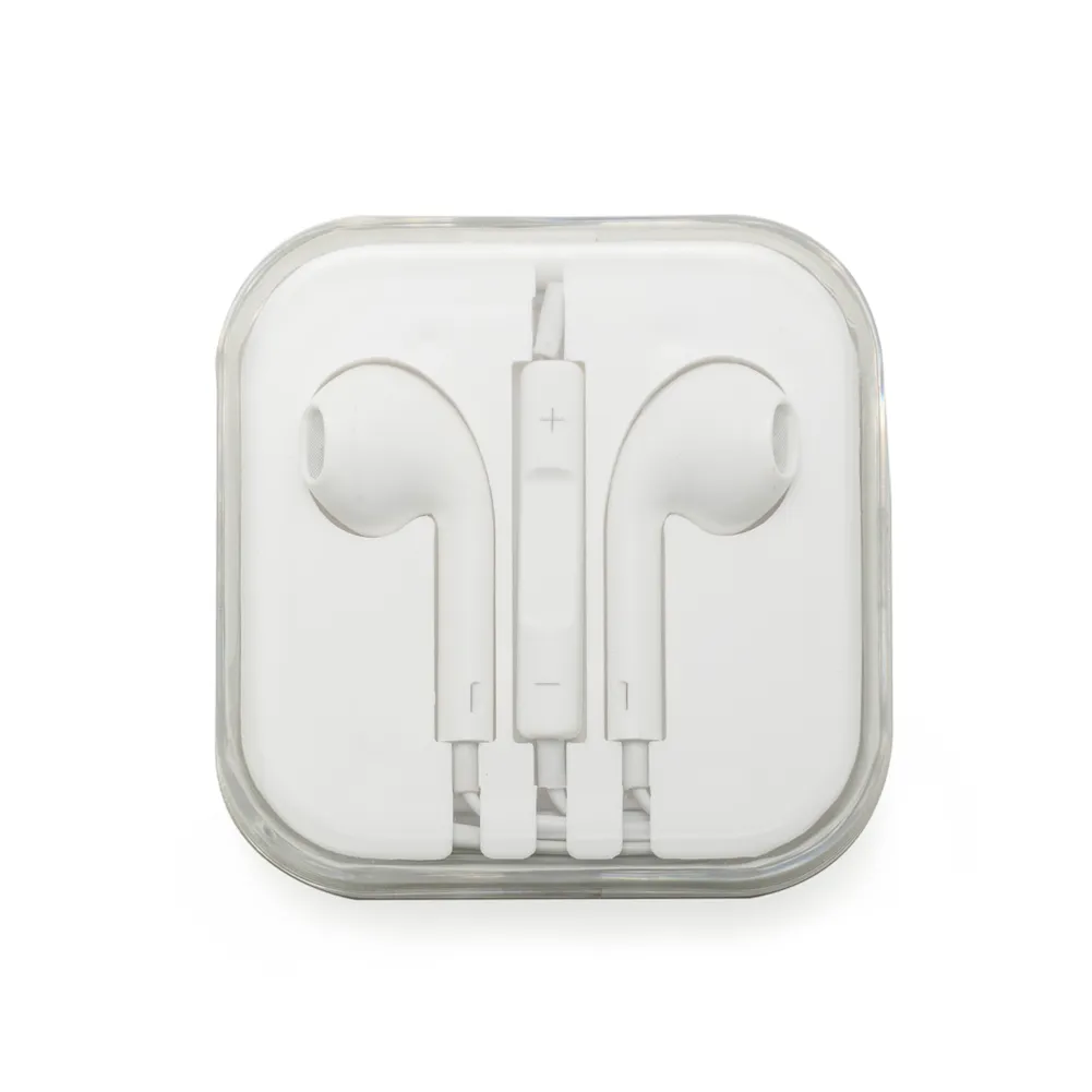 Fone de ouvido estéreo com microfone e controle de volume. Fone de ouvido plástico na cor branca, entrada P2, possui indicativo L(left) e R(right) na área interna do fone, detalhes internos vazados no fone(possibilita a visão da tela de proteção), microfone acoplado no suporte com desenho indicativo e no verso do suporte controle de volume com desenho indicativo – e +. Acompanha embalagem plástica branca com tampa acrílica transparente. OBS.: Botões de volumes funcionam apenas em aparelhos da linha APPLE.