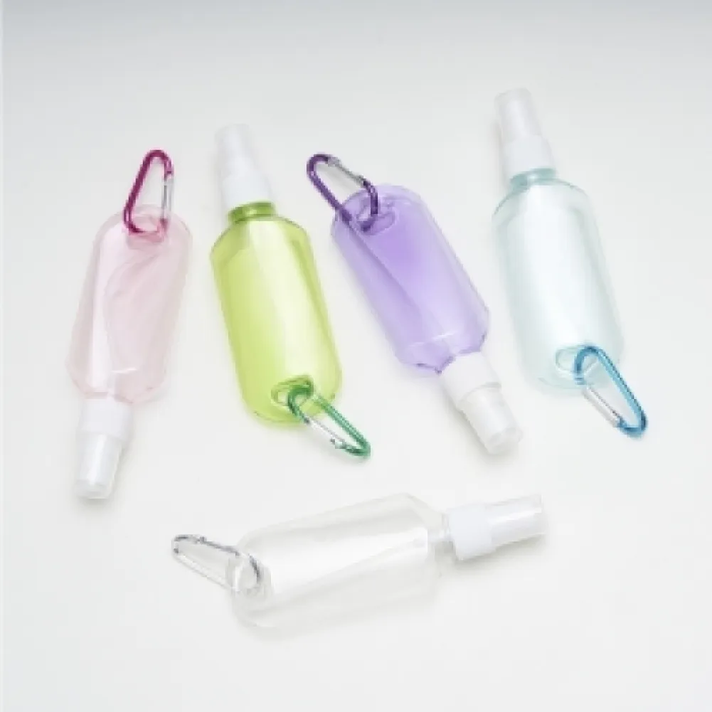 Frasco plástico spray com capacidade de 100ml, contém tampa branca com encaixe rosqueável e acompanha chaveiro mosquetão para transporte.