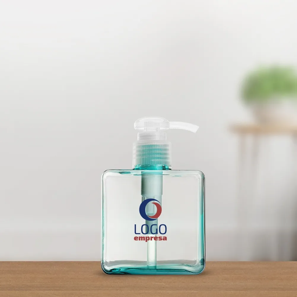 Frasco 280ml produzido em plástico colorido fosco, tampa rosquável com válvula pump e trava de segurança, basta pressionar e girar a parte superior para travar o produto.