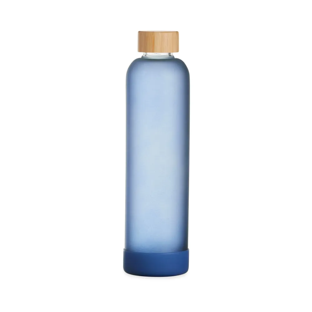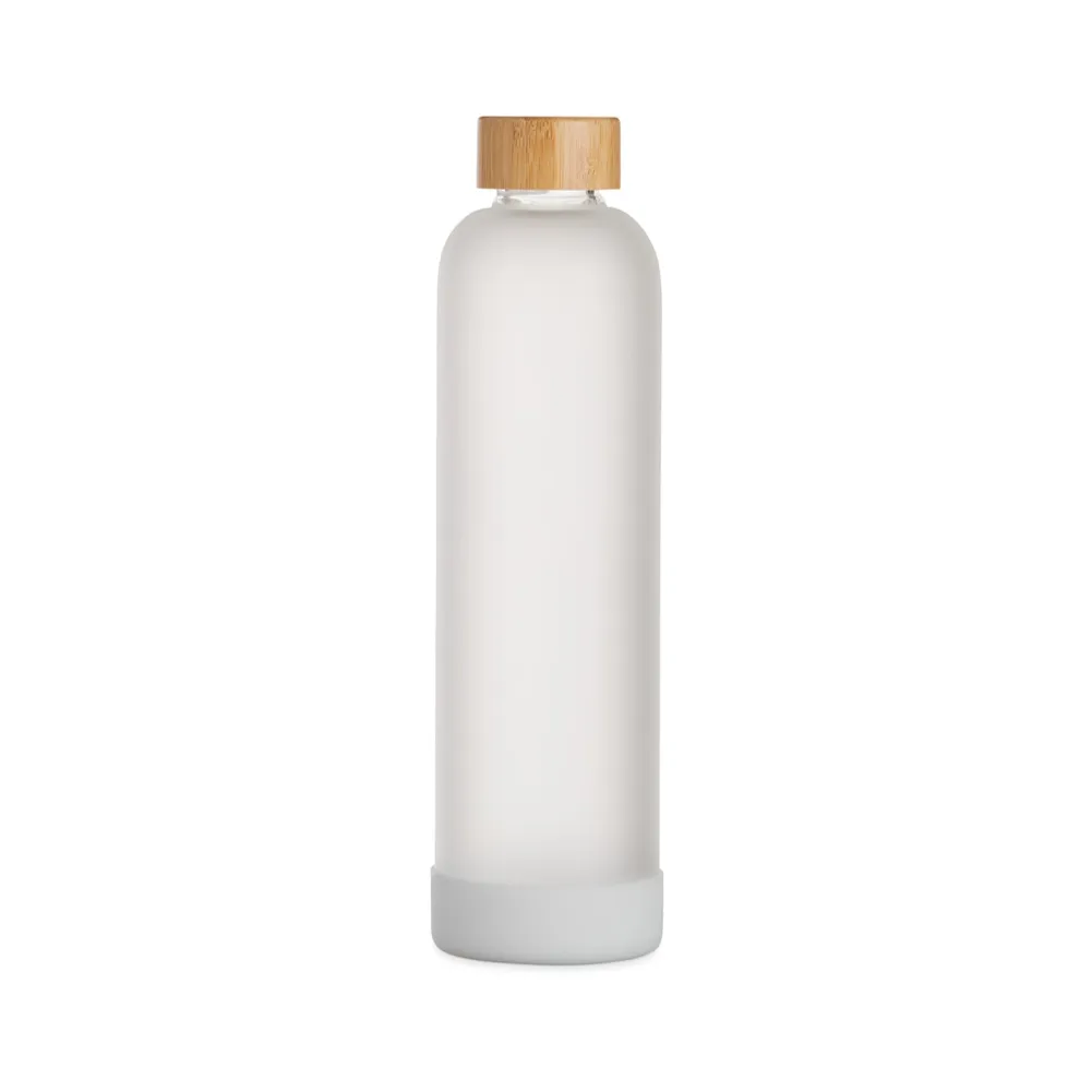 Garrafa de vidro borossilicato com capacidade de 1 litro. Contém tampa de bambu e base de silicone anti-impacto (removível).