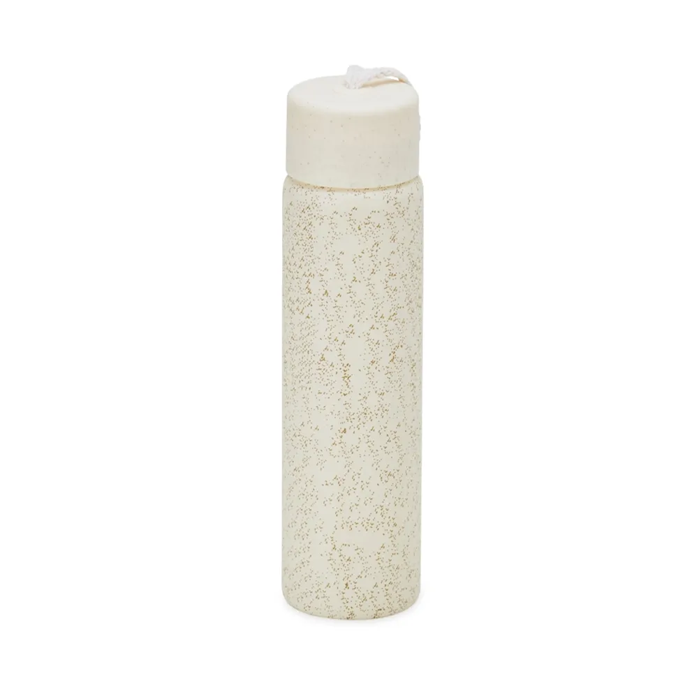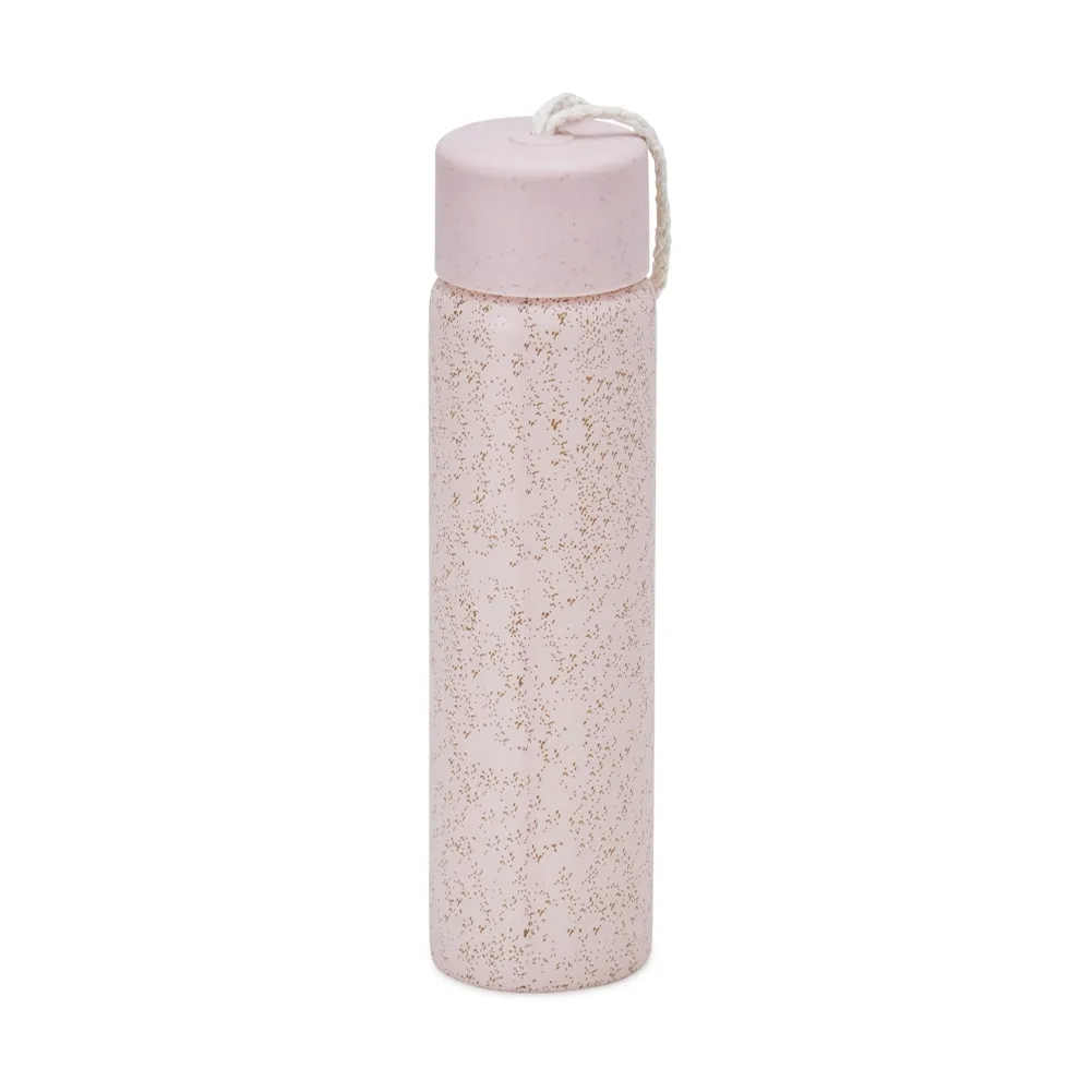 Garrafa de vidro 330ml com acabamento adesivado, tampa plástica e alça de algodão para transporte.