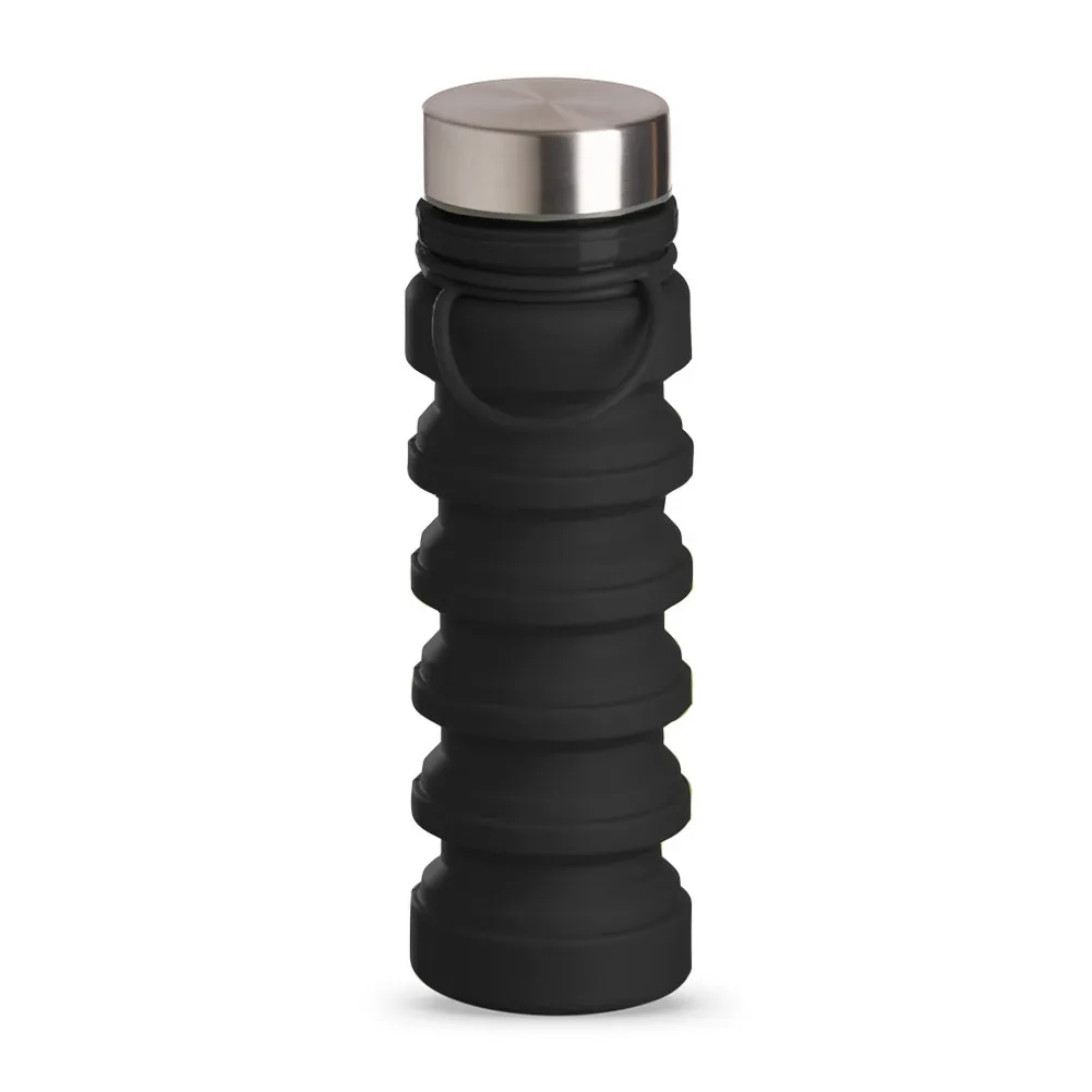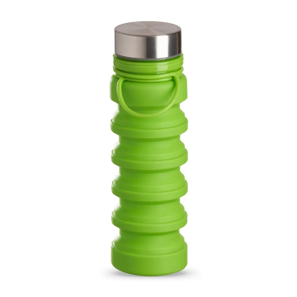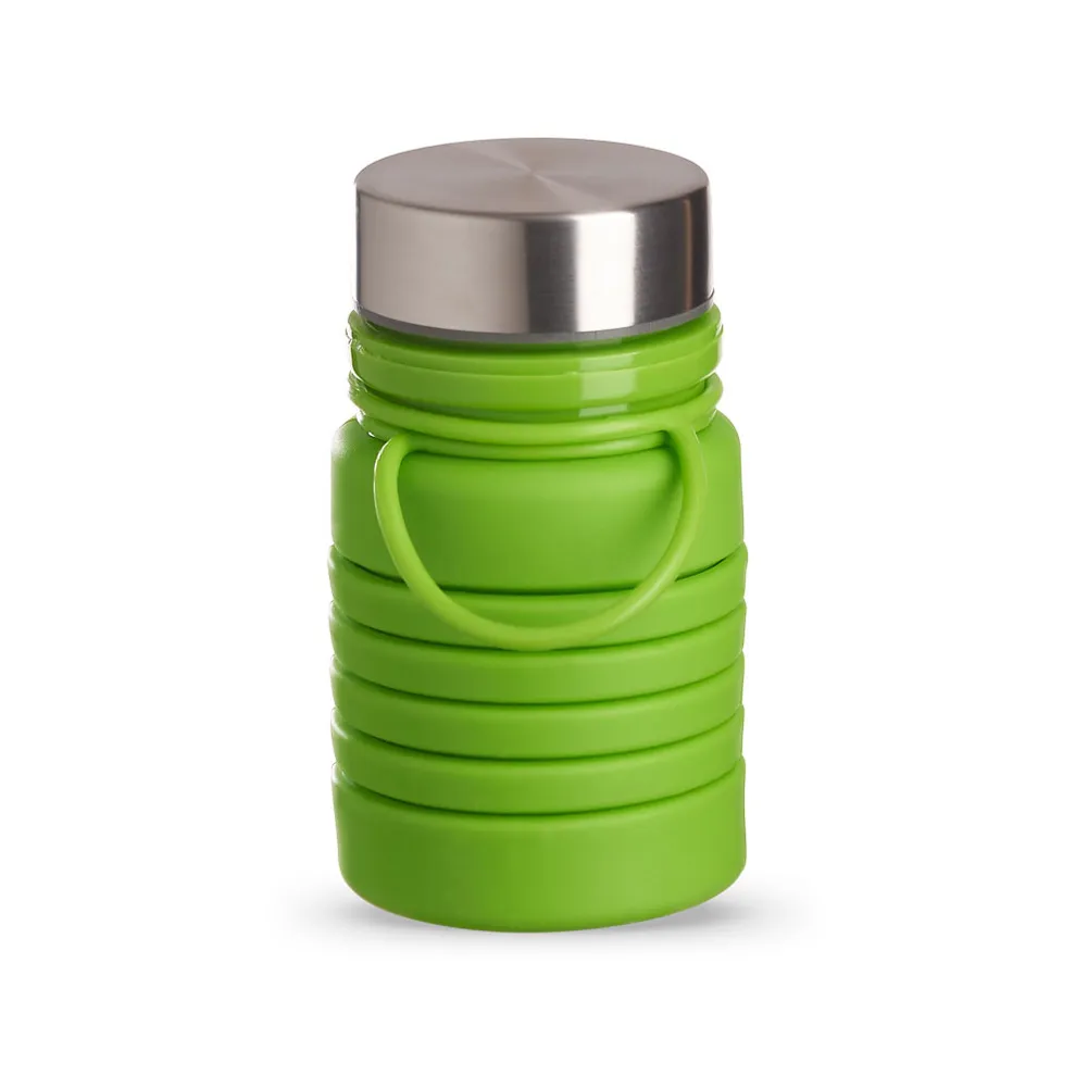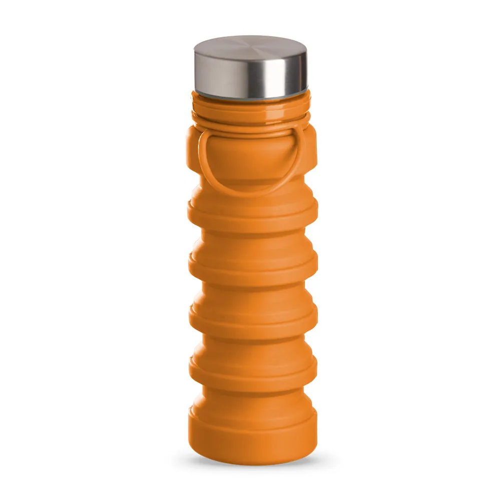 Garrafa em silicone retrátil com alça, tampa de metal. Capacidade 500ml. BPA FREE Dimensão do produto: Alt. retraída 12,5 cm, altura expandida 22,5 cm. Diâmetro 7 cm Peso do produto: 0,190kg Embalagem: Caixa de papelão branca. Quant. da caixa: 50kg Peso da caixa: 10.5kg Dimensão da caixa: 40,5x40,5x29cm