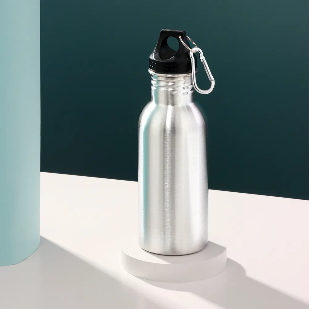 Garrafa de inox com capacidade de 640ml, contém tampa plástica rosqueável e acompanha chaveiro mosquetão.