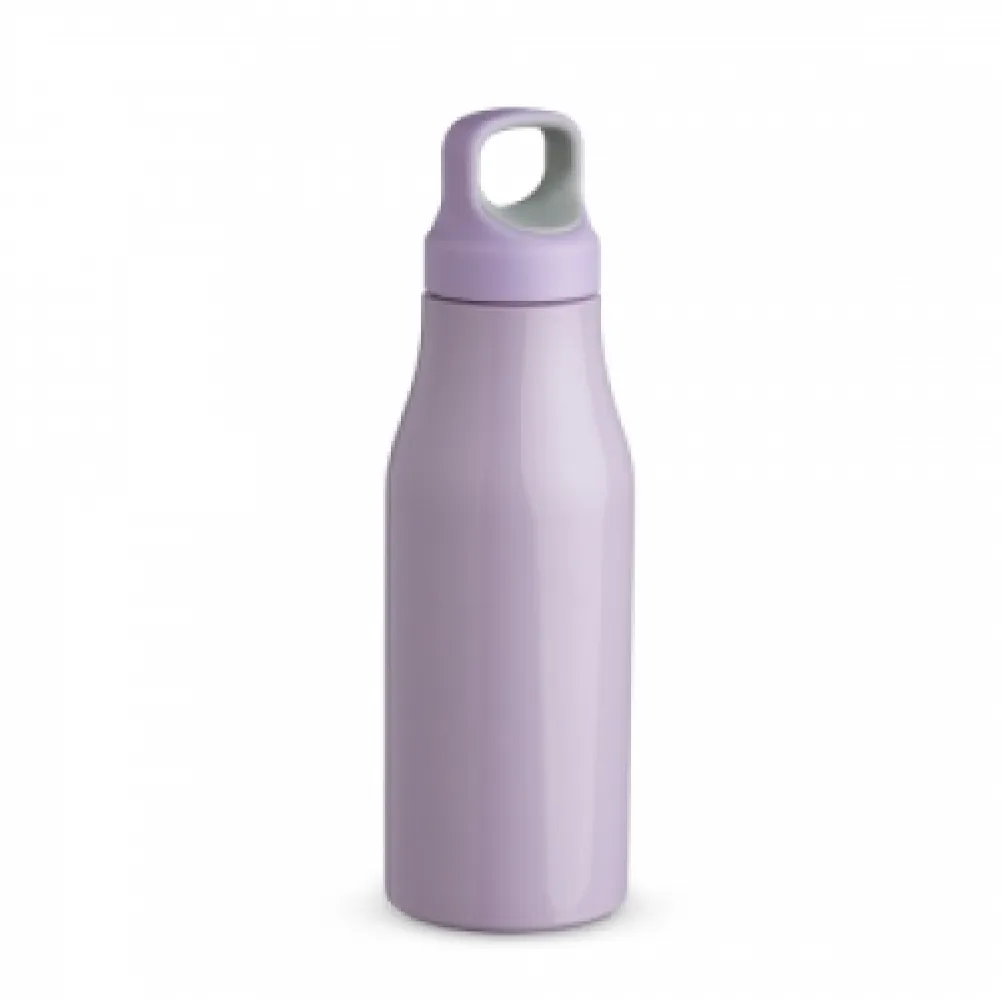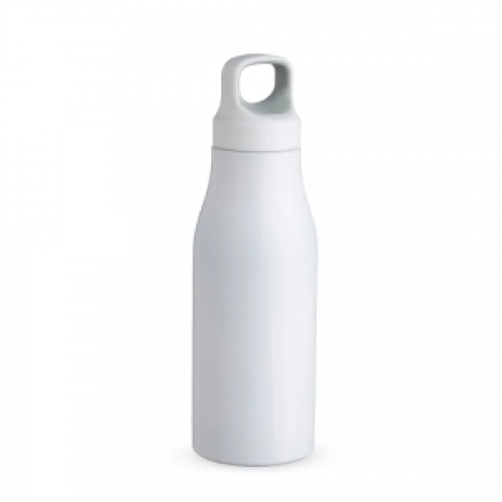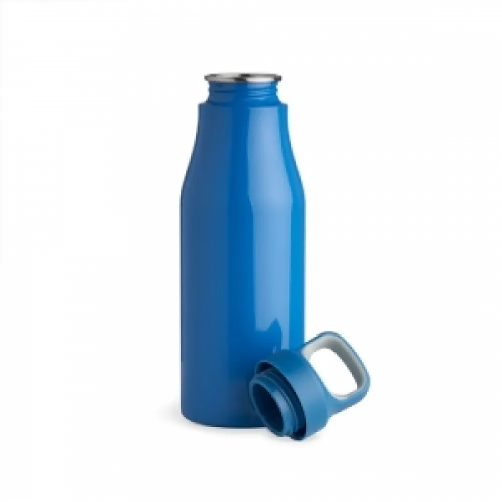 Garrafa 650ml em inox com tampa rosqueável com alça para transporte.