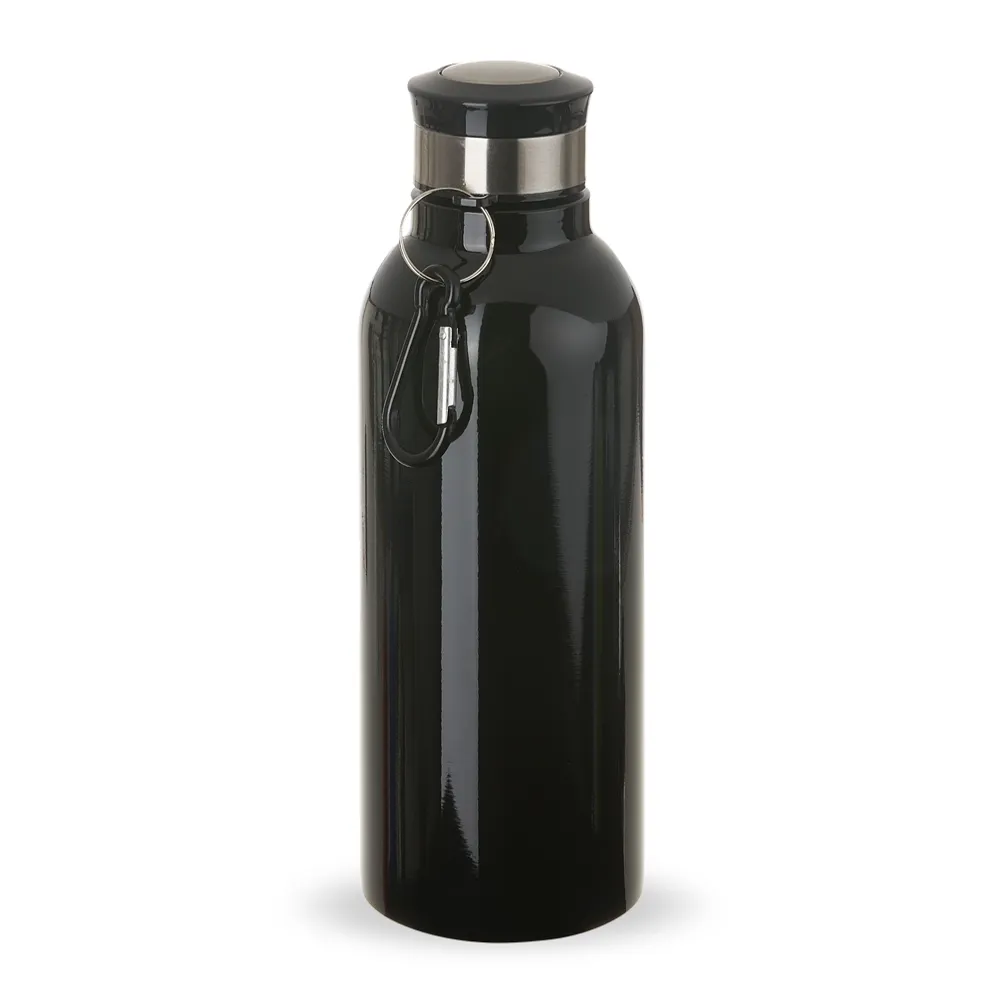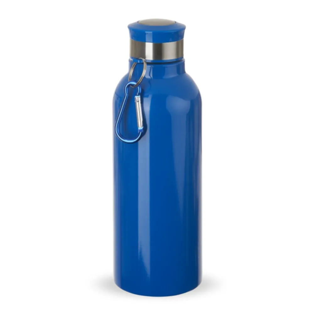 Garrafa Inox 700ml com pintura colorida e detalhes em prata. Possui tampa rosqueável e acompanha chaveiro mosquetão.