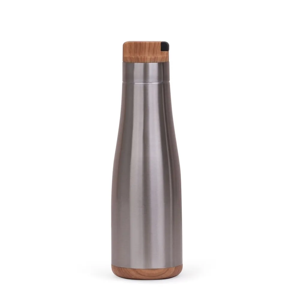 Garrafa de Inox 730ml com detalhes plásticos imitando de madeira, possui tampa rosqueável com alça retrátil emborrachada.