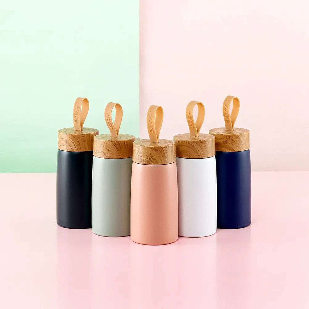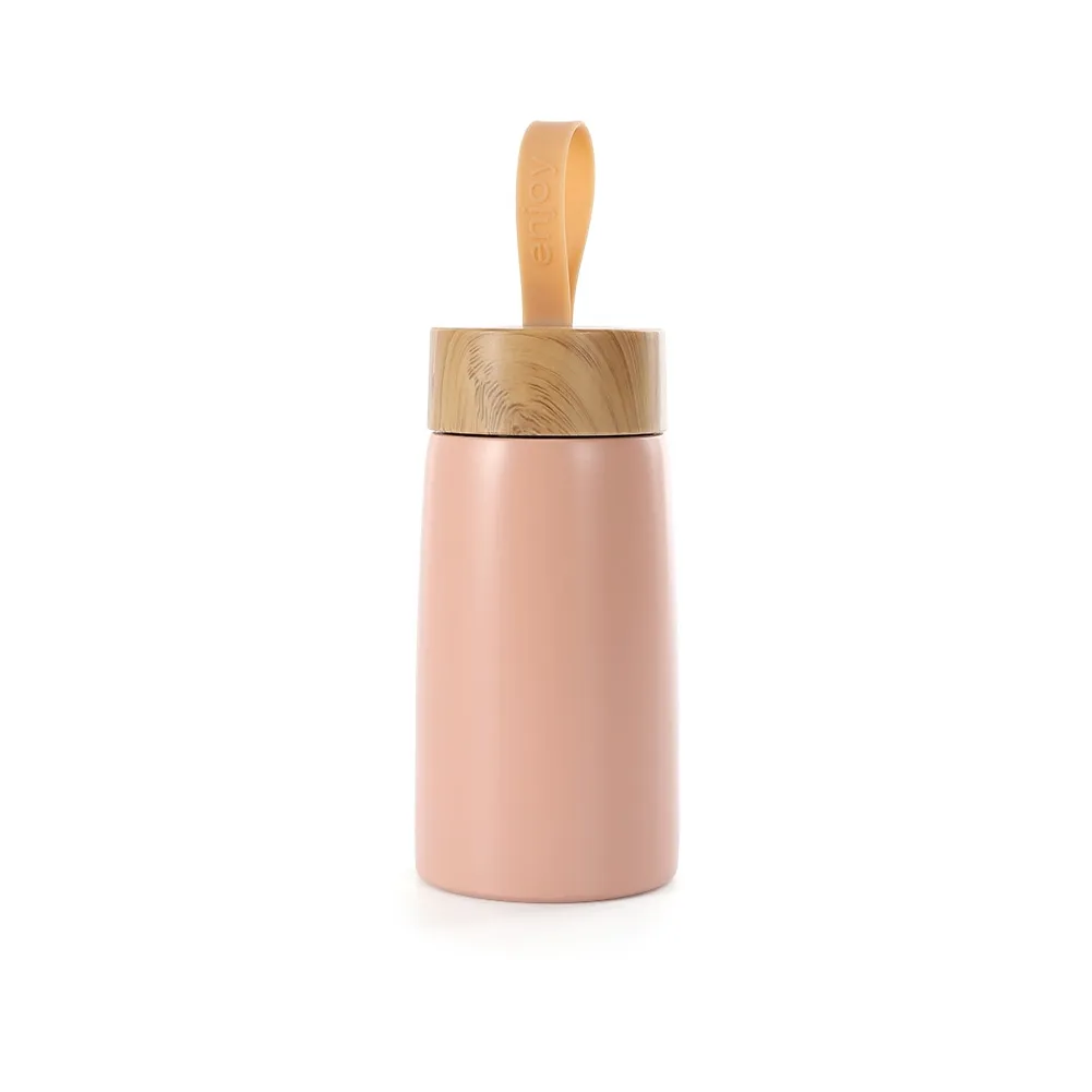 Garrafa inox 304 com parede dupla, capacidade de 250ml. Contém tampa plástica com design de bambu e alça de silicone para transporte.