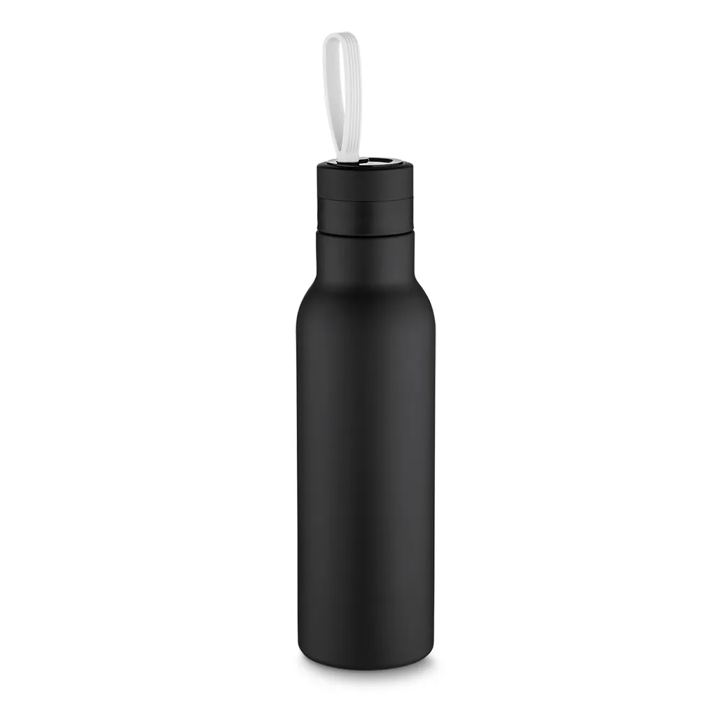Garrafa parede dupla 500ml com pintura preto fosco e alça colorida. Tampa rosqueável e parte inferior com borracha antideslizante.