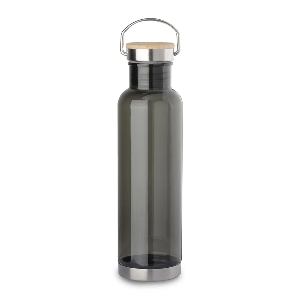 Garrafa plástica 850ml com tampa e base em inox. Tampa com alça de transporte e detalhe em bambu.