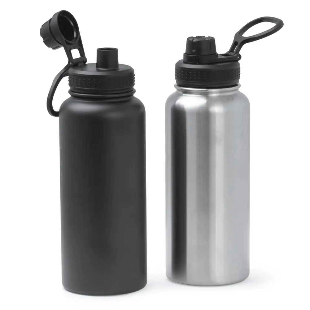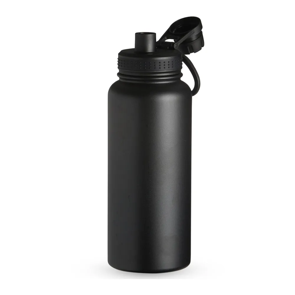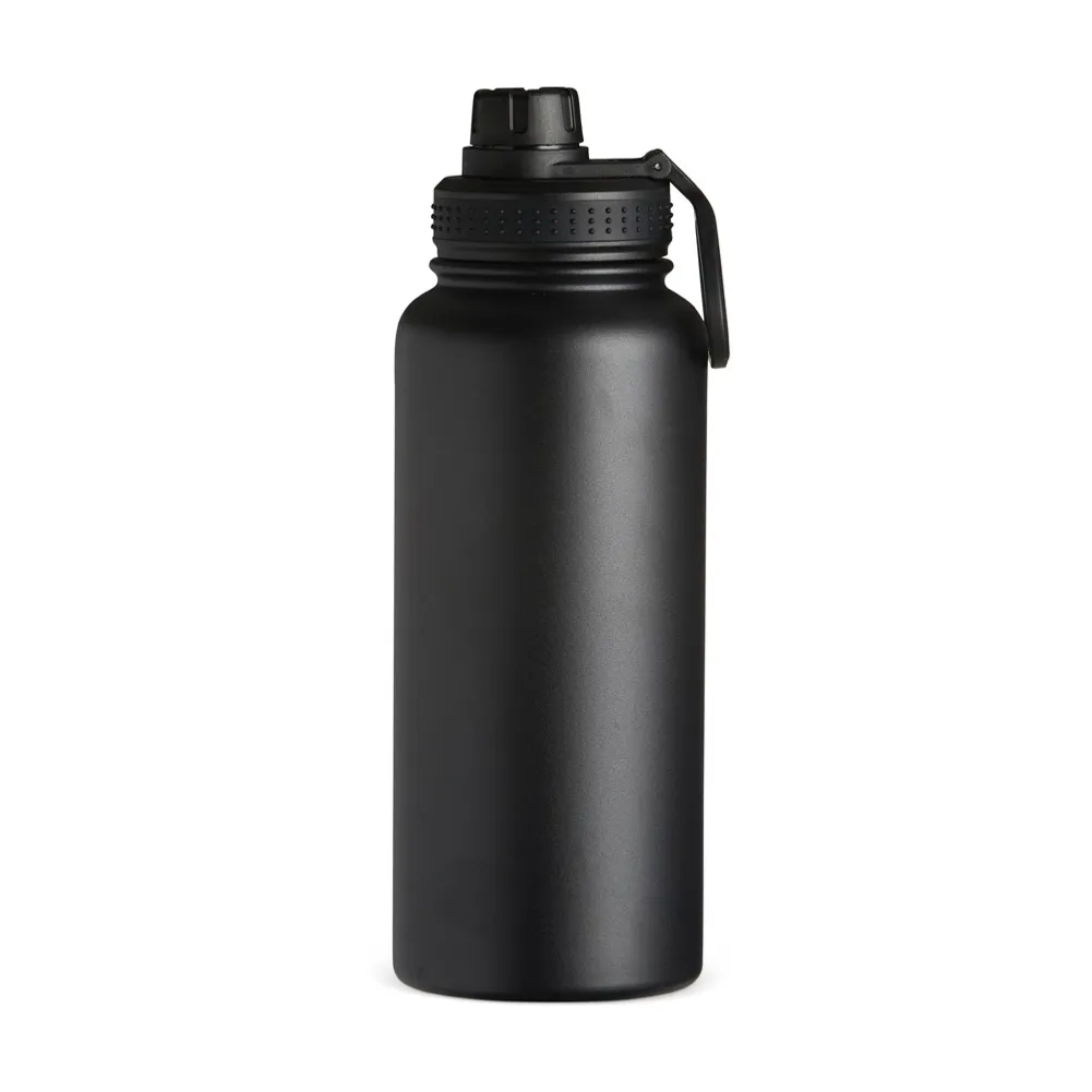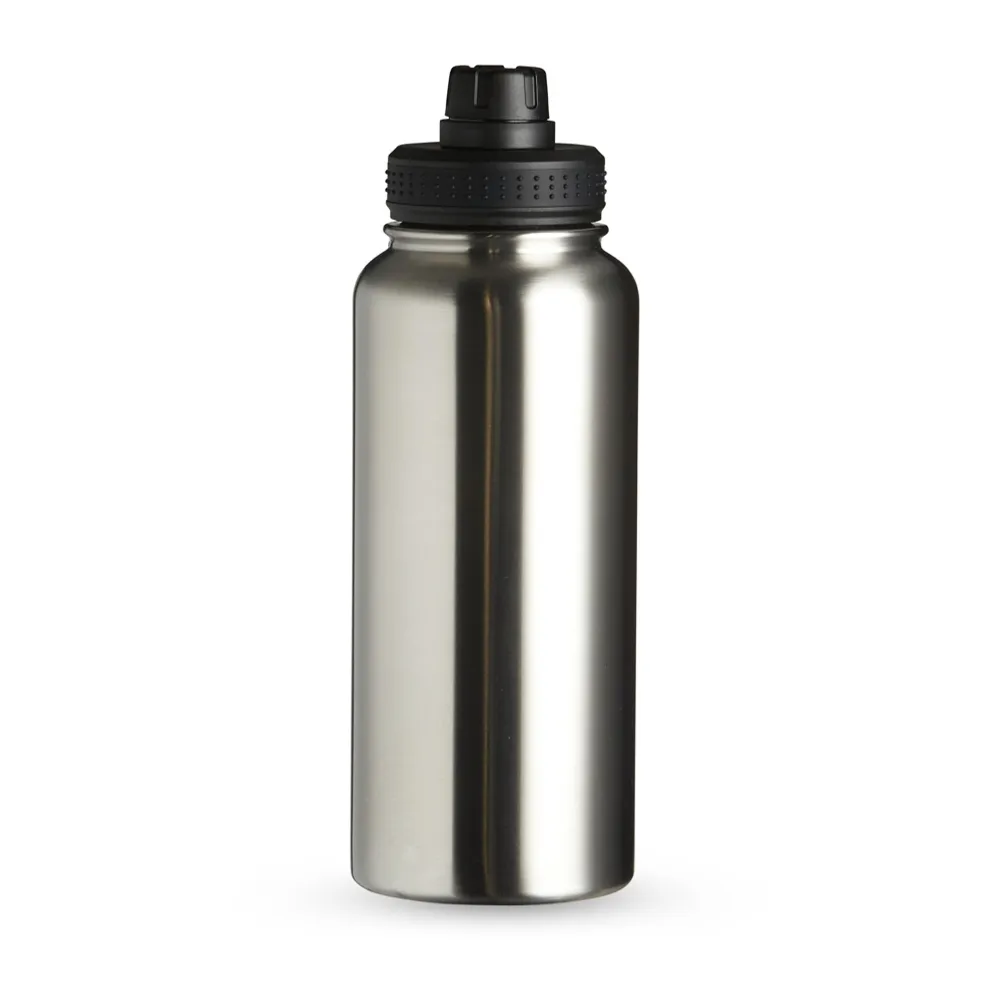 Garrafa térmica com capacidade de 1 litro em inox com parede dupla, contém tampa plástica rosqueável com bocal e alça para transporte acoplados.
