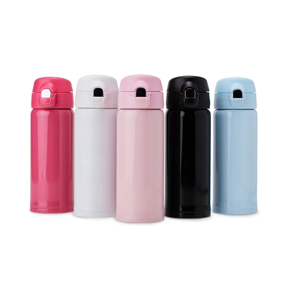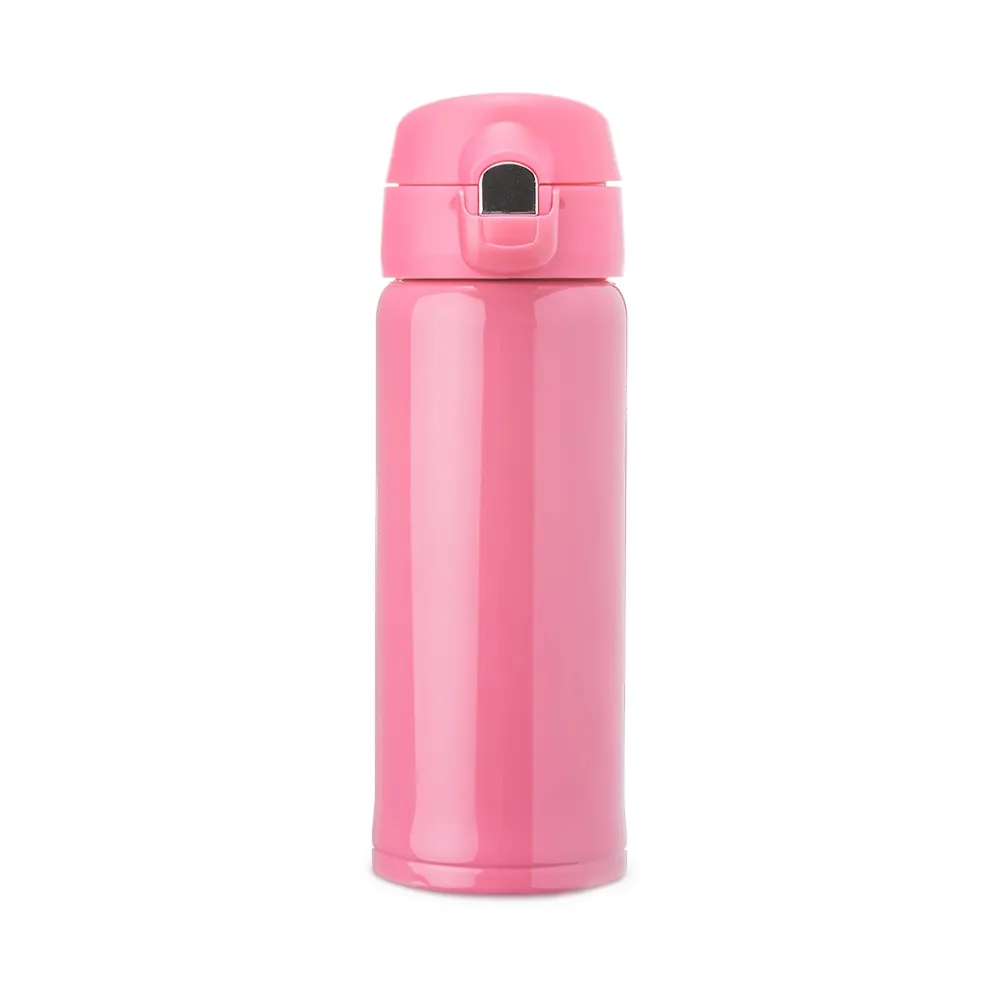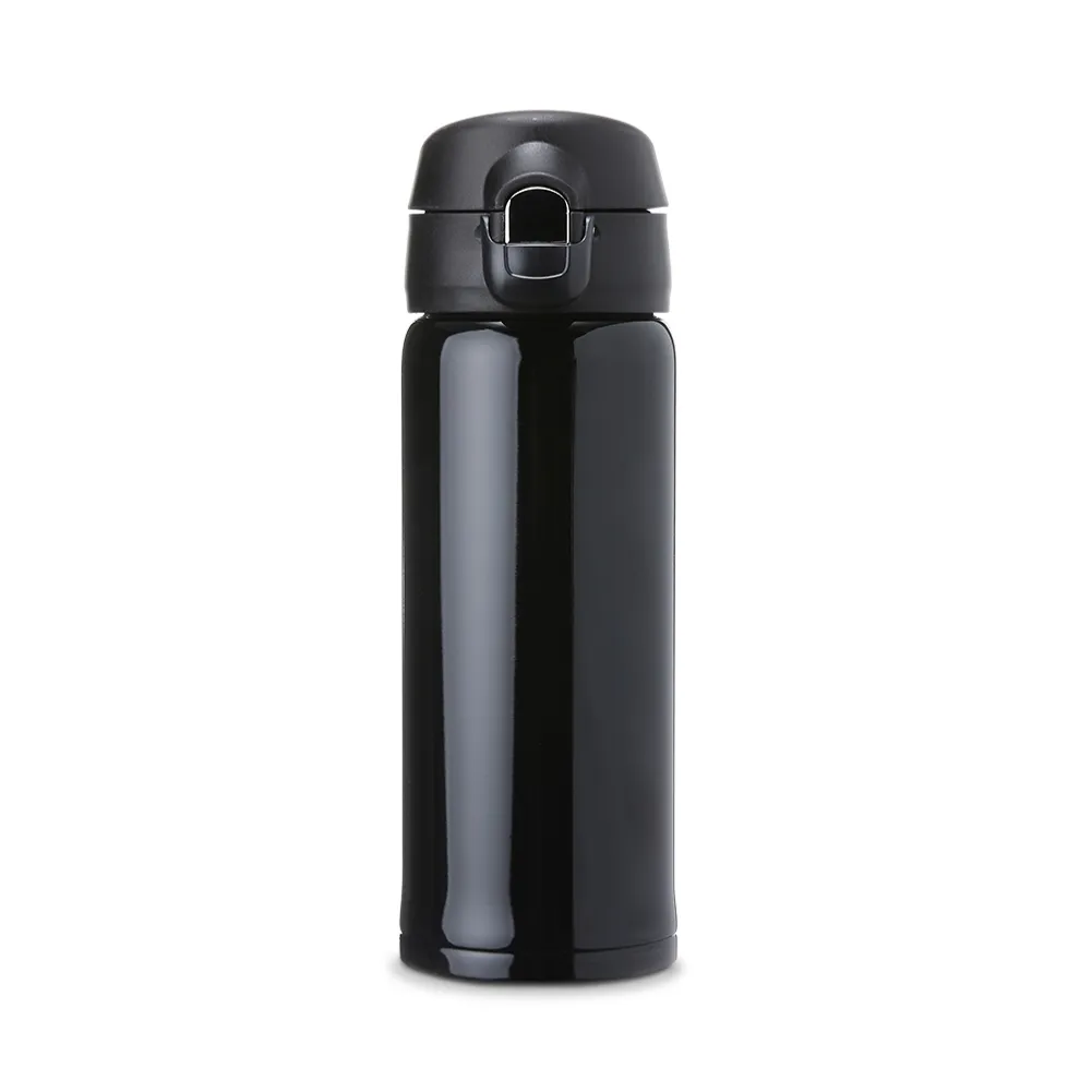 Garrafa térmica parede dupla feita inox 304, capacidade de 400ml. Tampa de polipropileno com botão de acionamento e trava de segurança.