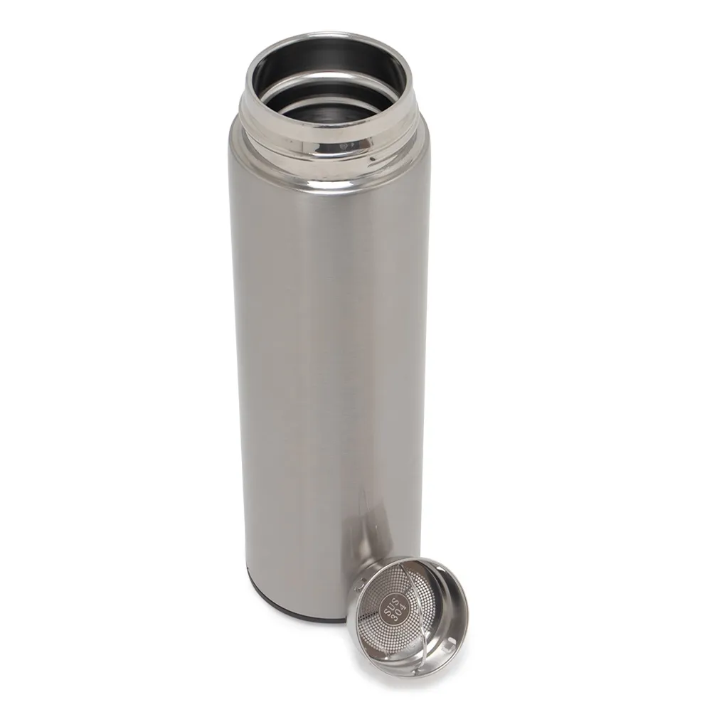 Garrafa térmica 500ml em inox com parede dupla, infusor e tampa rosqueável com detalhe em madeira.
