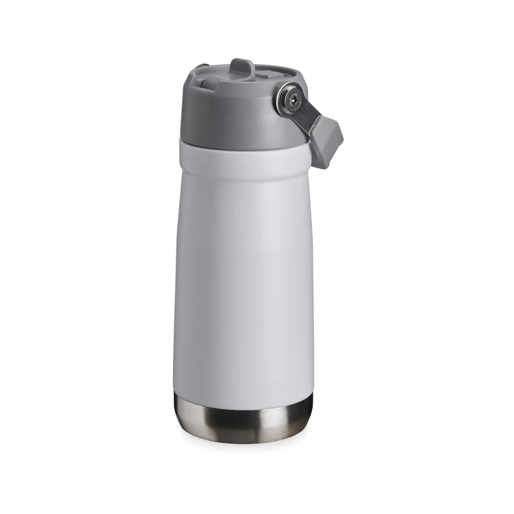 Garrafa térmica de parede dupla em inox, capacidade de 500ml. Tampa com alça de transporte, bico flip e canudo interno.