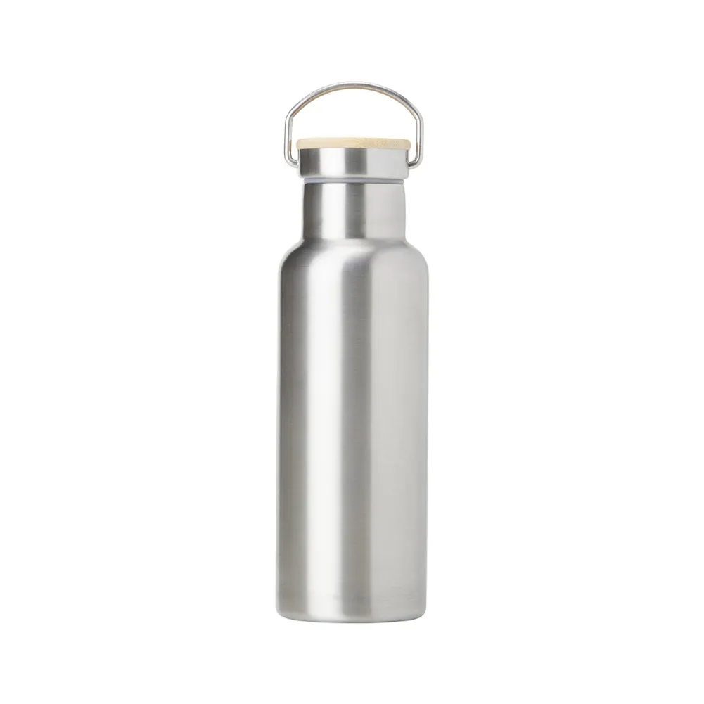 Garrafa térmica feita em inox com parede dupla, capacidade de 500ml. Tampa com acabamento em bambu e alça para transporte.
