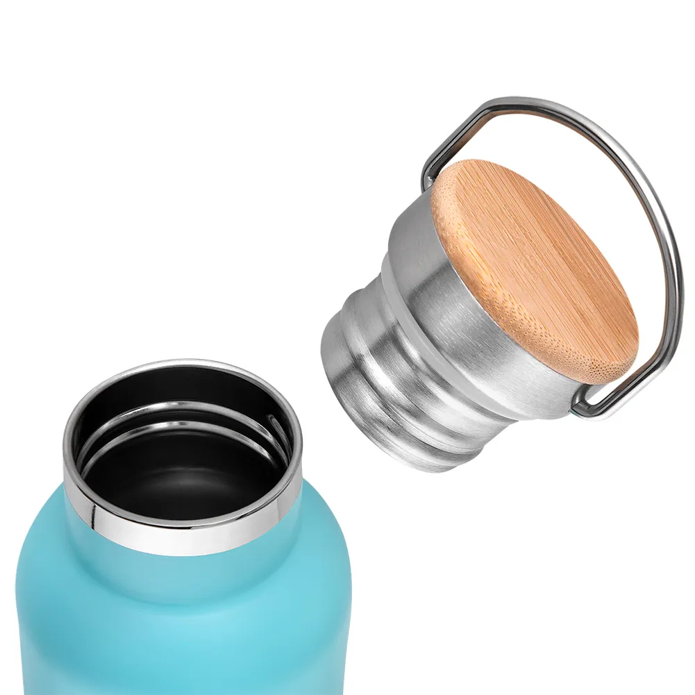 Garrafa térmica em aço inox com parede dupla isolada a vácuo, com capacidade de até 500ml. Conserva líquido quente por até 8 horas e líquido frio até 12 horas. Tampa com revestimento em fibra de bambu. Alça em metal. Detalhe cromado. Pintura fosca. Dimensão Produto: 22xø7,2cm Peso do Produto: 0,320kg Embalagem: Caixa Branca Quant. por Caixa: 50pcs Dimensão Caixa: 39,5x39,5x48cm Peso da Caixa: 17 kg