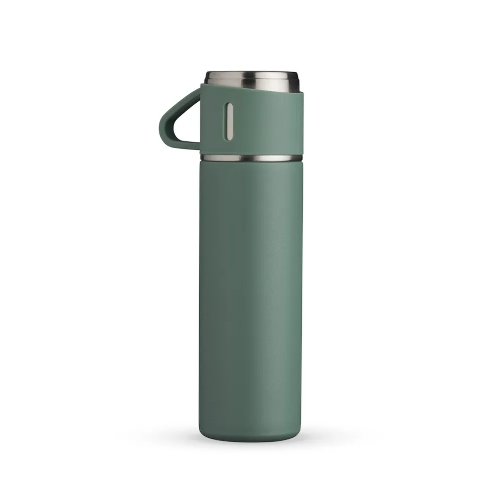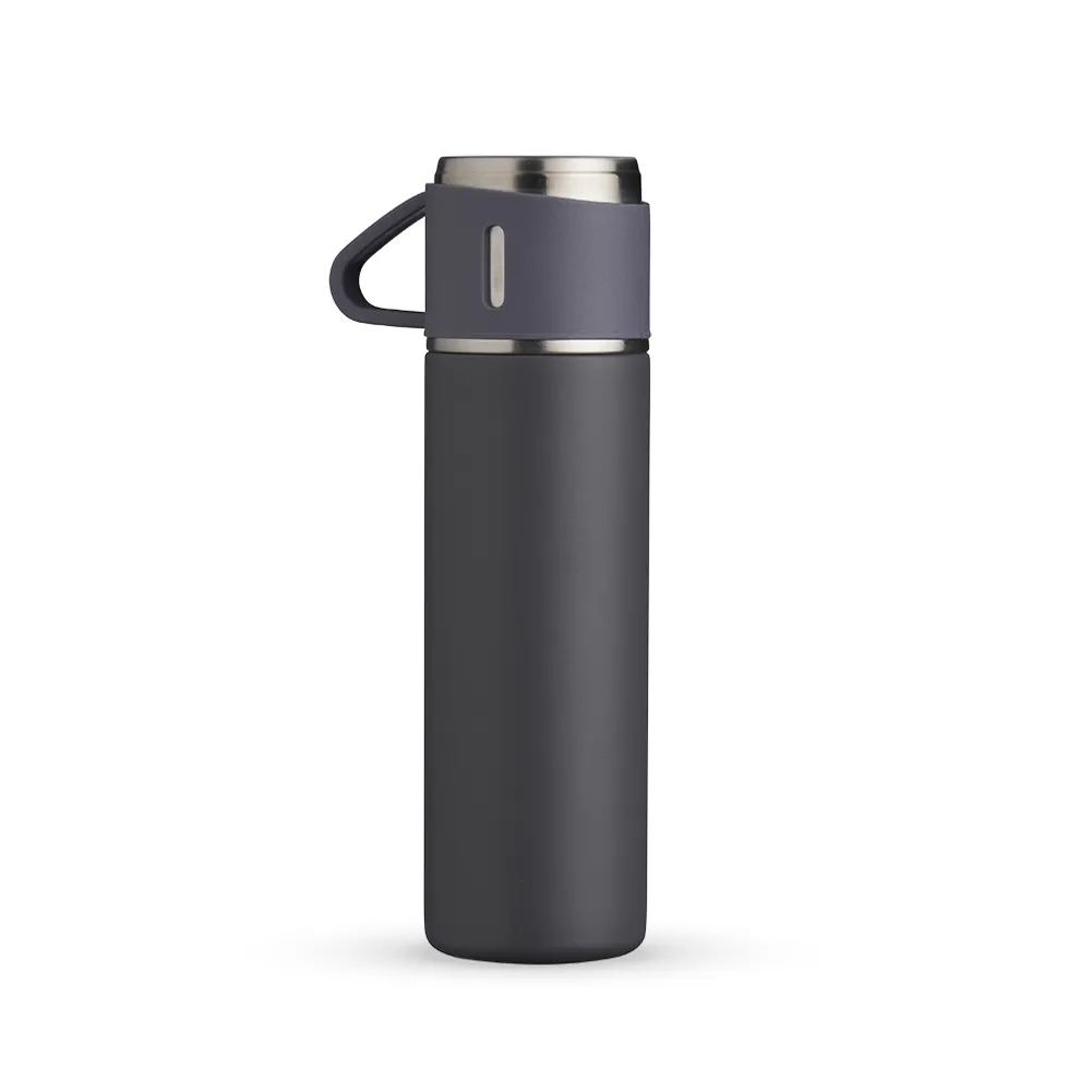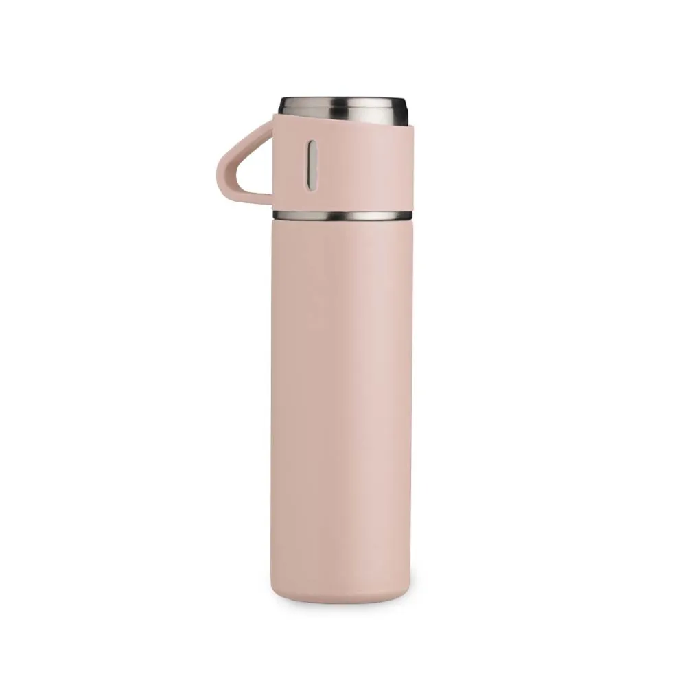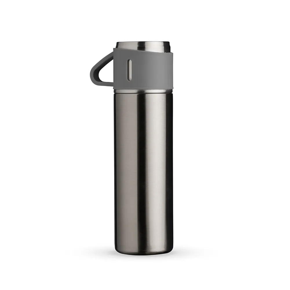 Garrafa térmica 450ml em inox com tampa que pode ser utilizada como caneca, tampa interna em plástico resistente (basta um clique para abrir ou fechar), base com borracha antiderrapante.