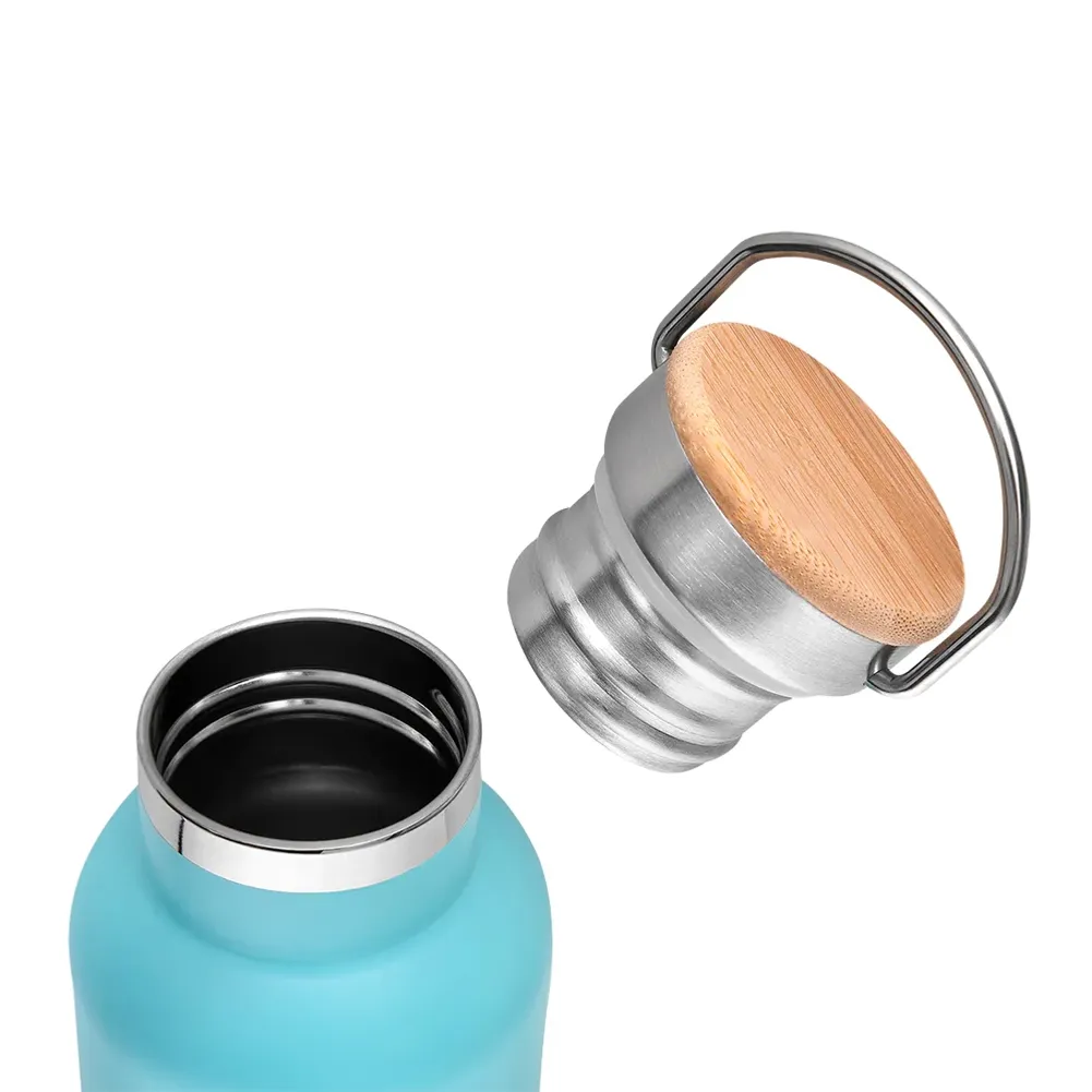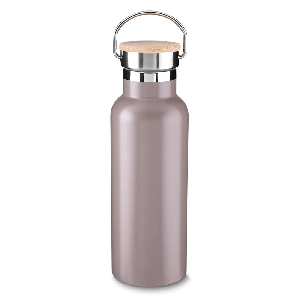 Garrafa térmica em inox 500 ml, tampa rosqueável com revestimento em fibra de bambu, alça de metal.