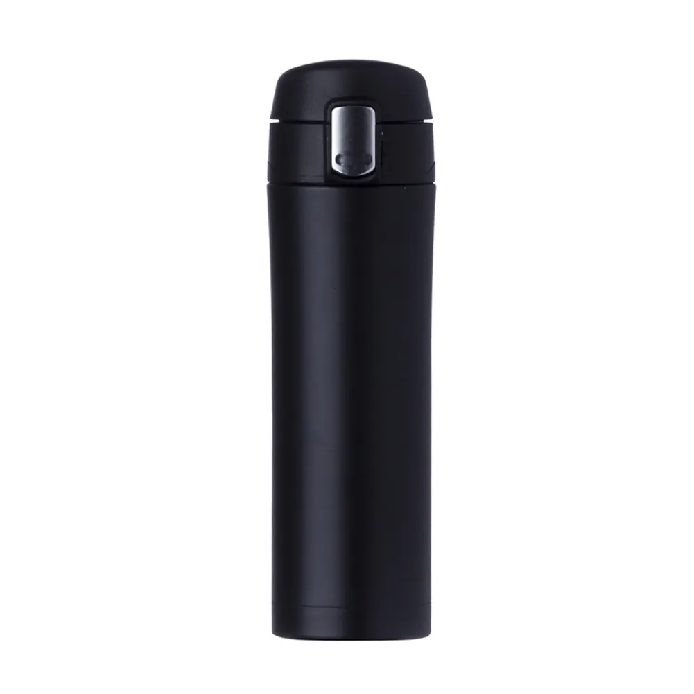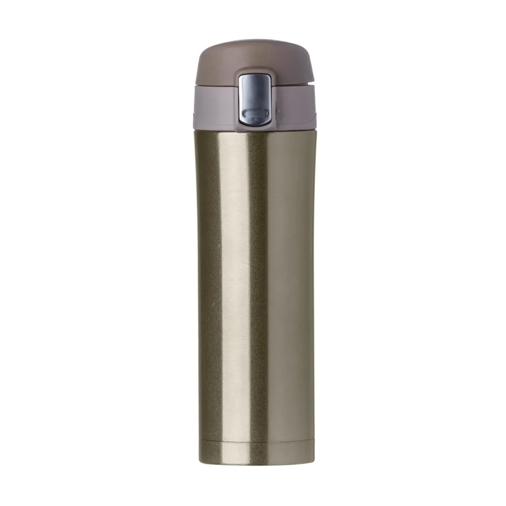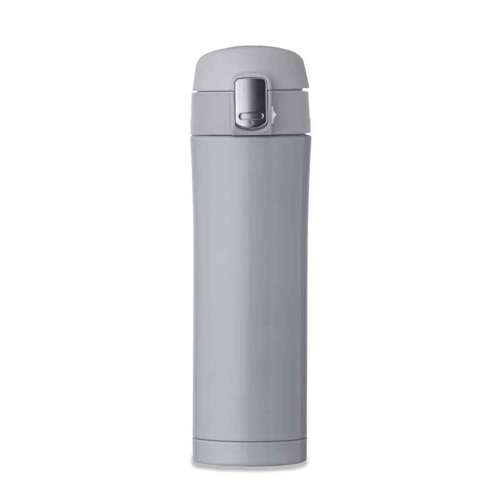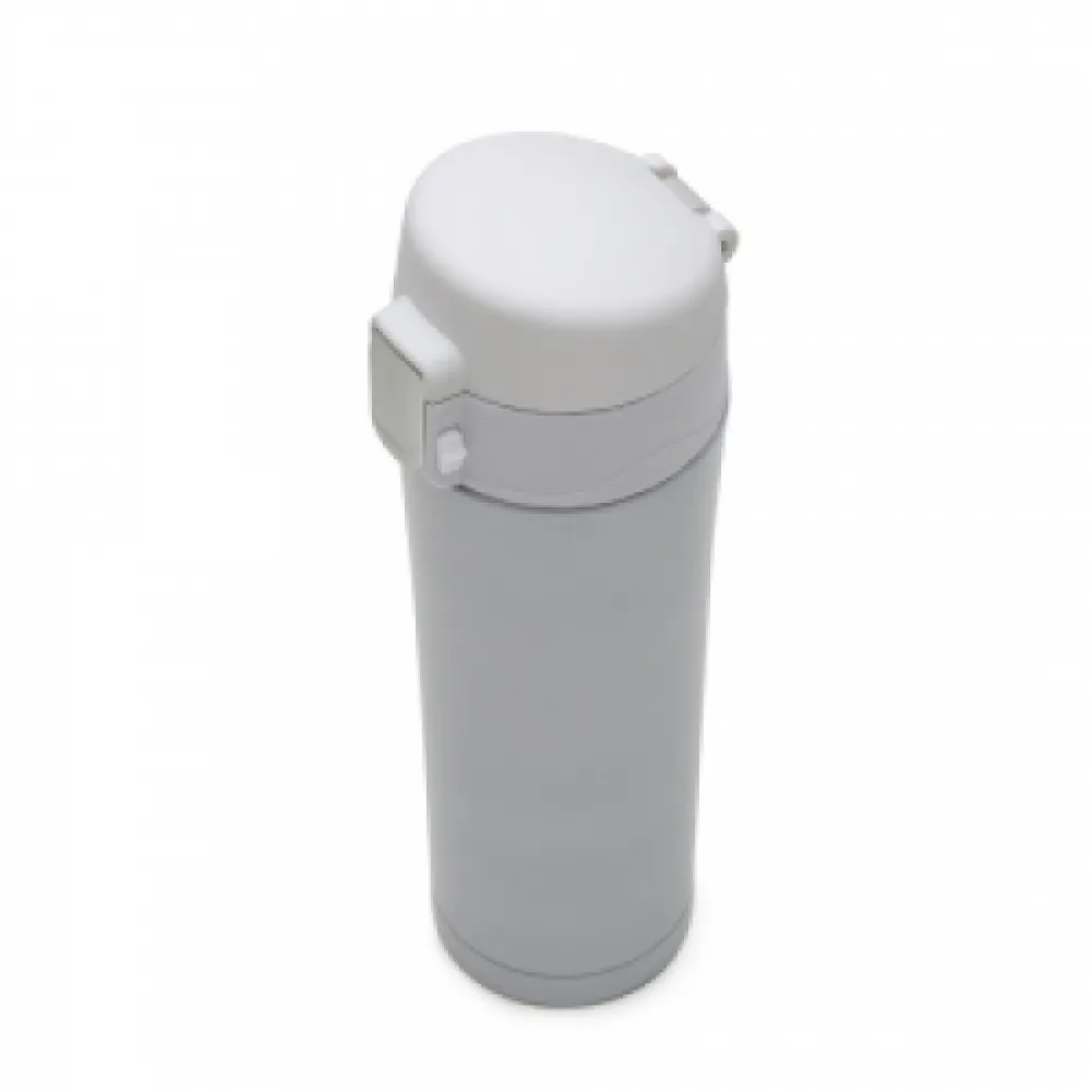 Garrafa térmica de 450ml de metal inteira colorida com botão de abertura prata. Possui um sistema de trava com desenho indicativo de cadeados(aberto e fechado), ao levantar o botão pequeno basta pressionar o botão central maior para abrir a tampa(possui na parte interna borracha protetora evitando vazar o líquido). Para abrir a tampa por completo basta rosqueá-la, parte interna revestida em inox.