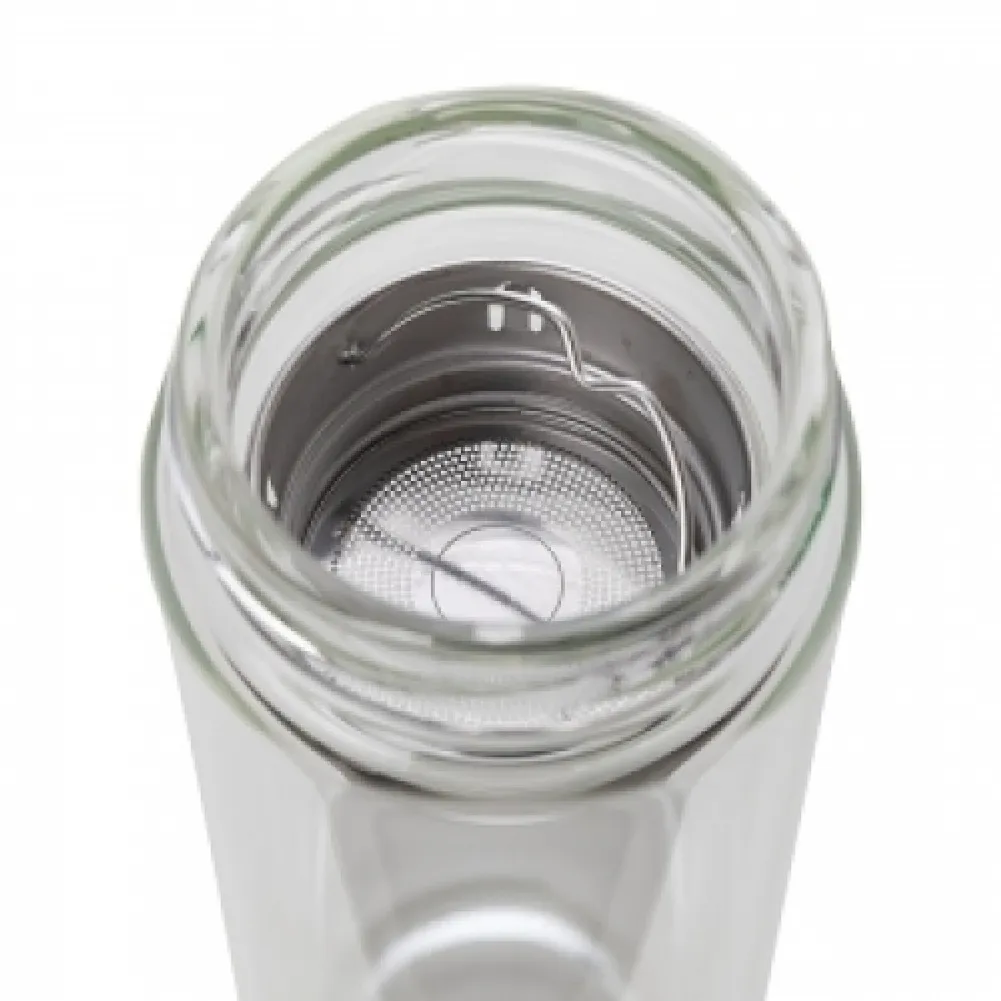 Garrafa de vidro 360ml com parede dupla e infusor de metal. Contém tampa rosqueavel de bambu e alça de tecido embutida.