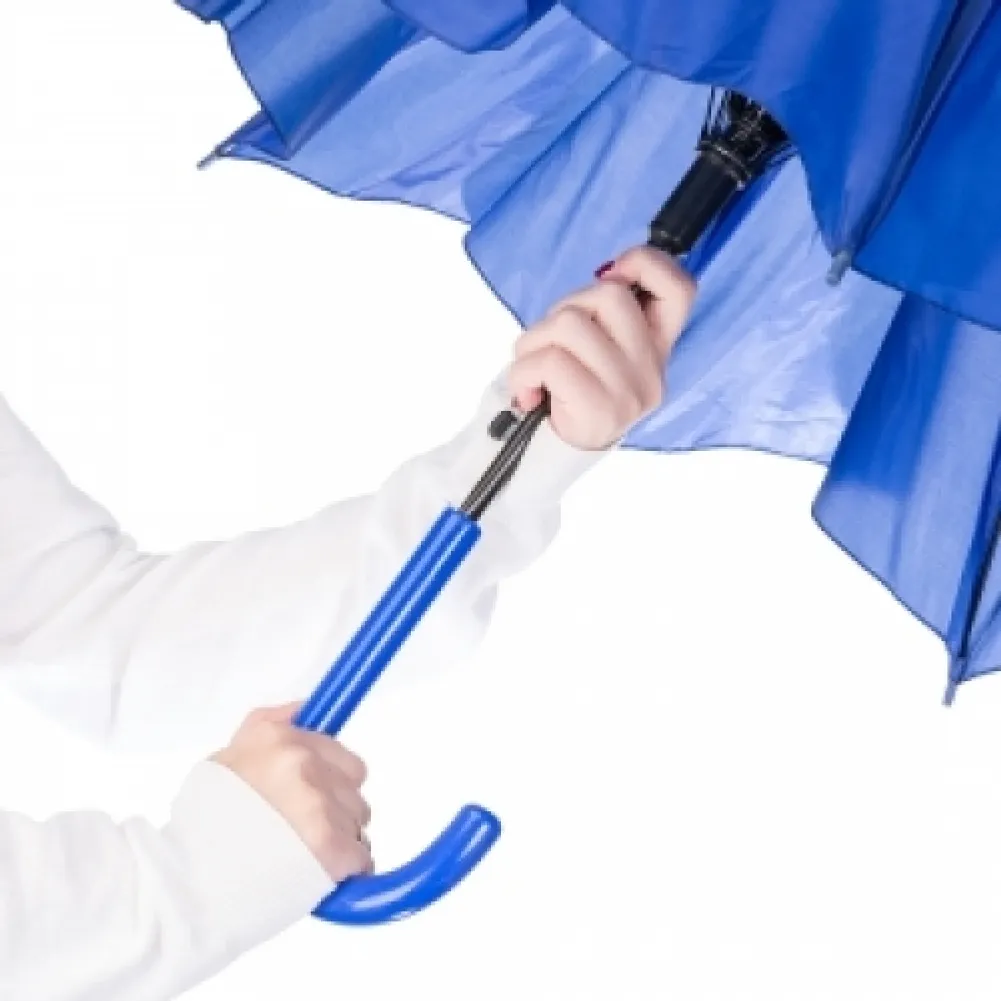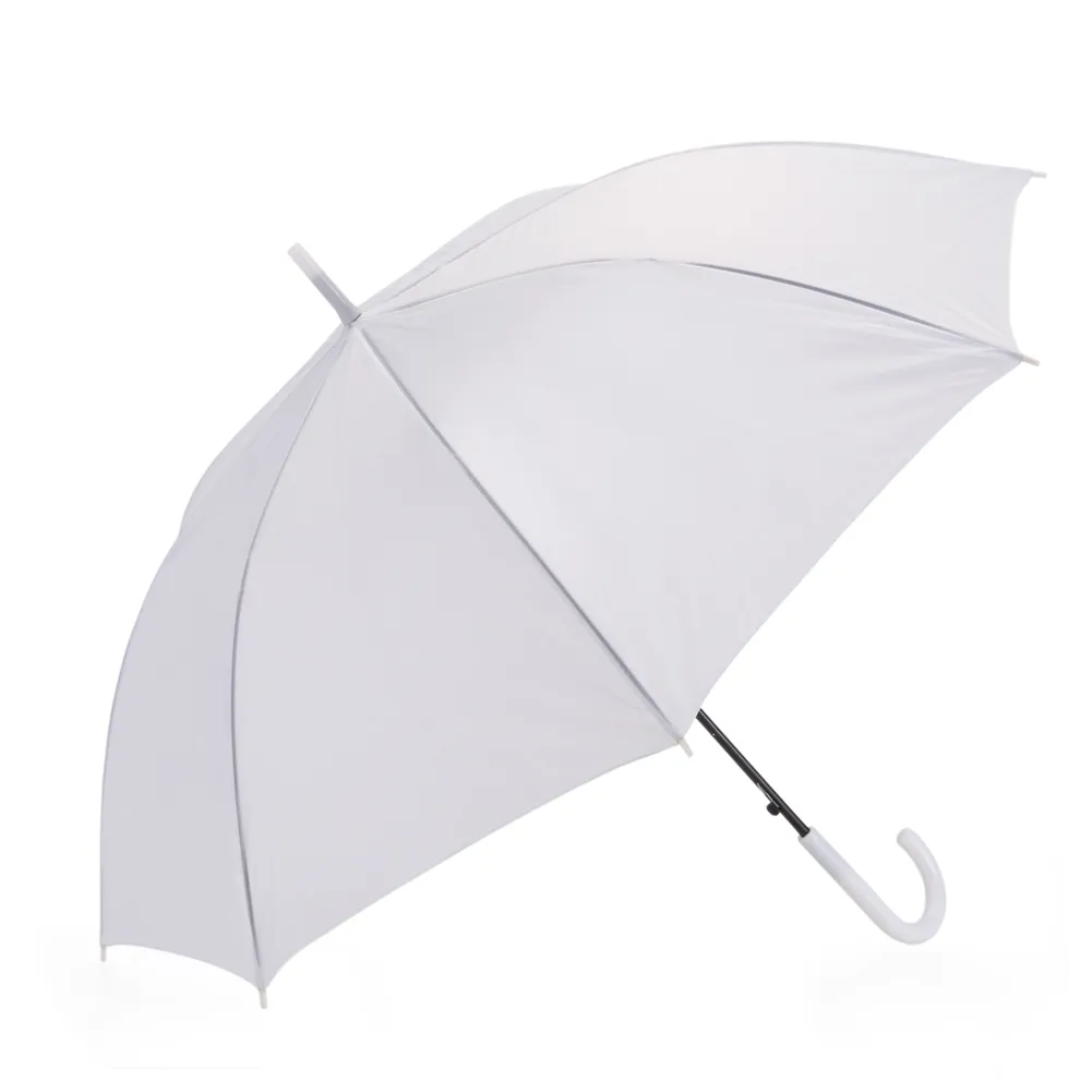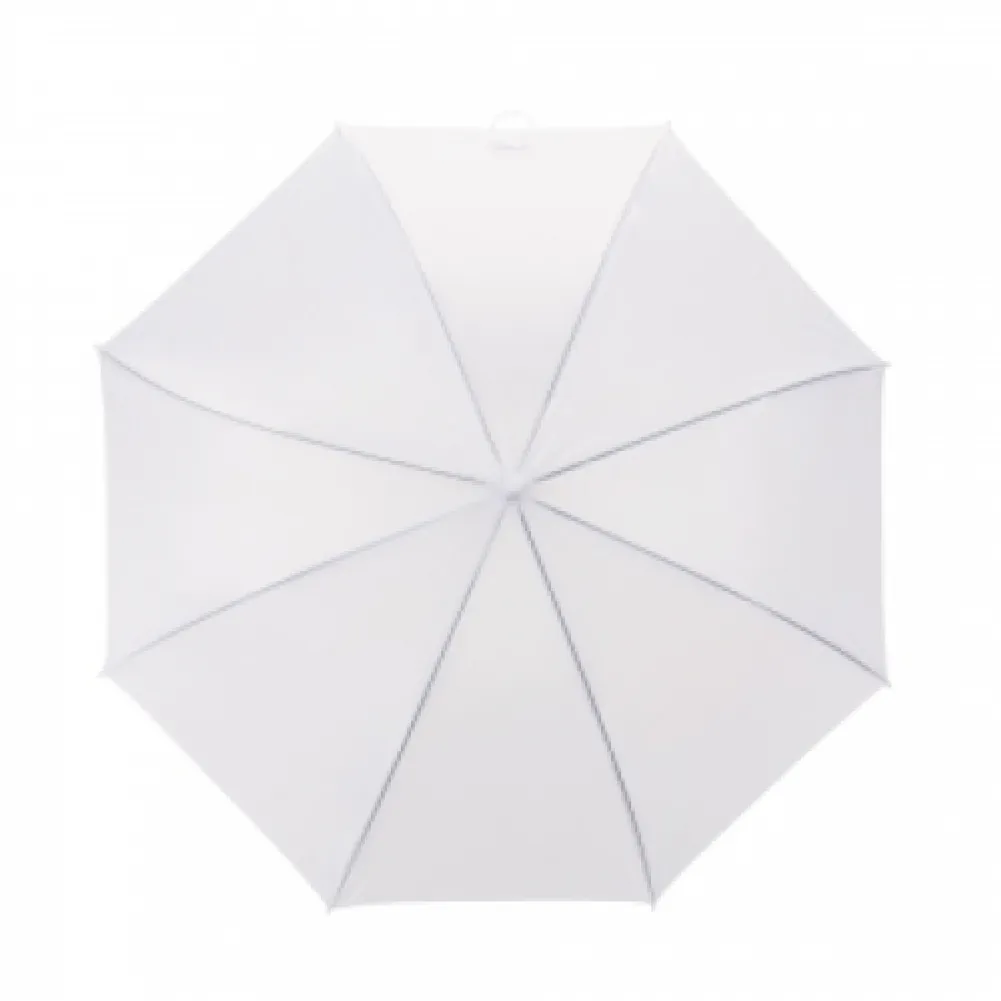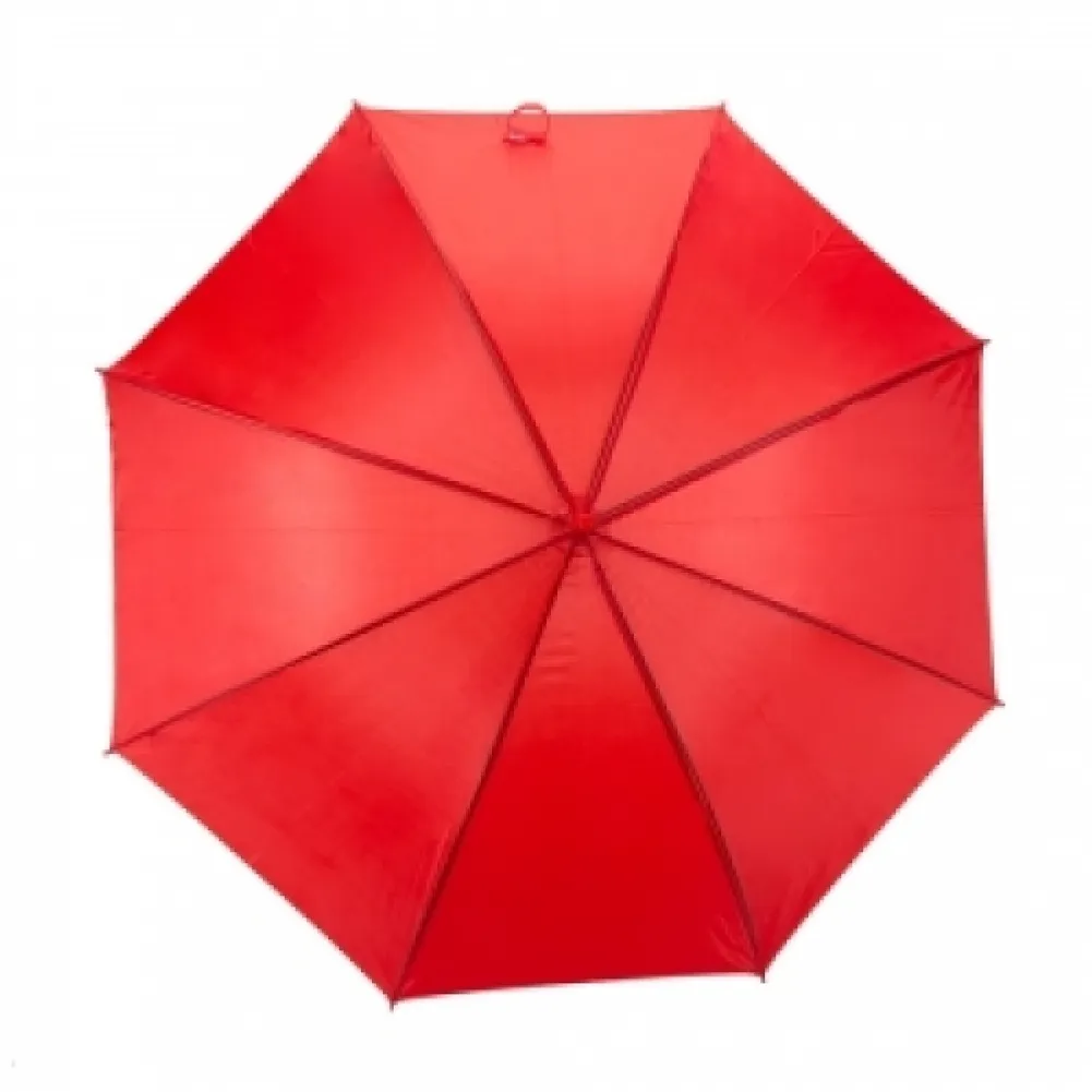 Guarda-chuva com tecido de nylon e abertura automática, basta acionar o botão inferior. Possui 8 varetas pretas de aço, pegador e bico superior de plástico.