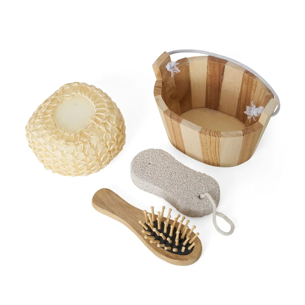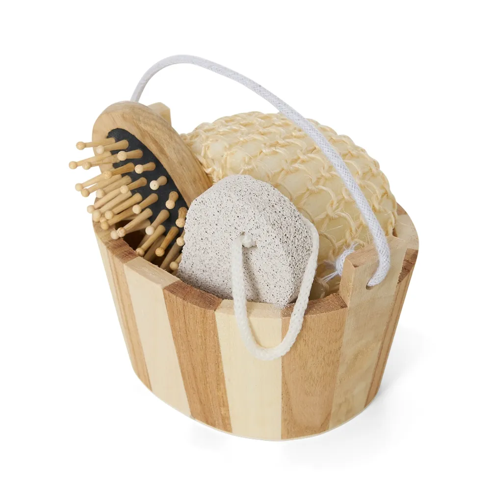 Kit banho em balde de madeira com 3 peças, contém: pedra pomes, escova de cabelo e bucha de banho. OBS.: PEDIDO MÍNIMO 10 PEÇAS!