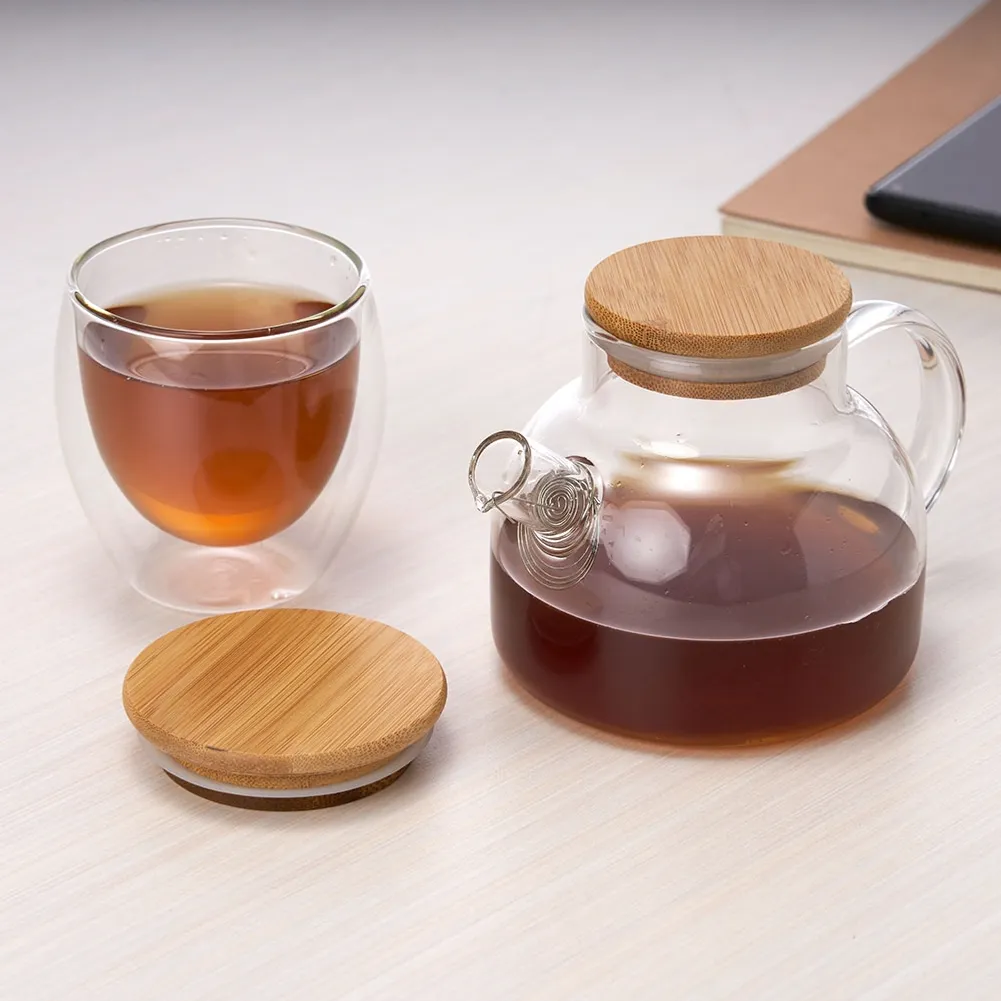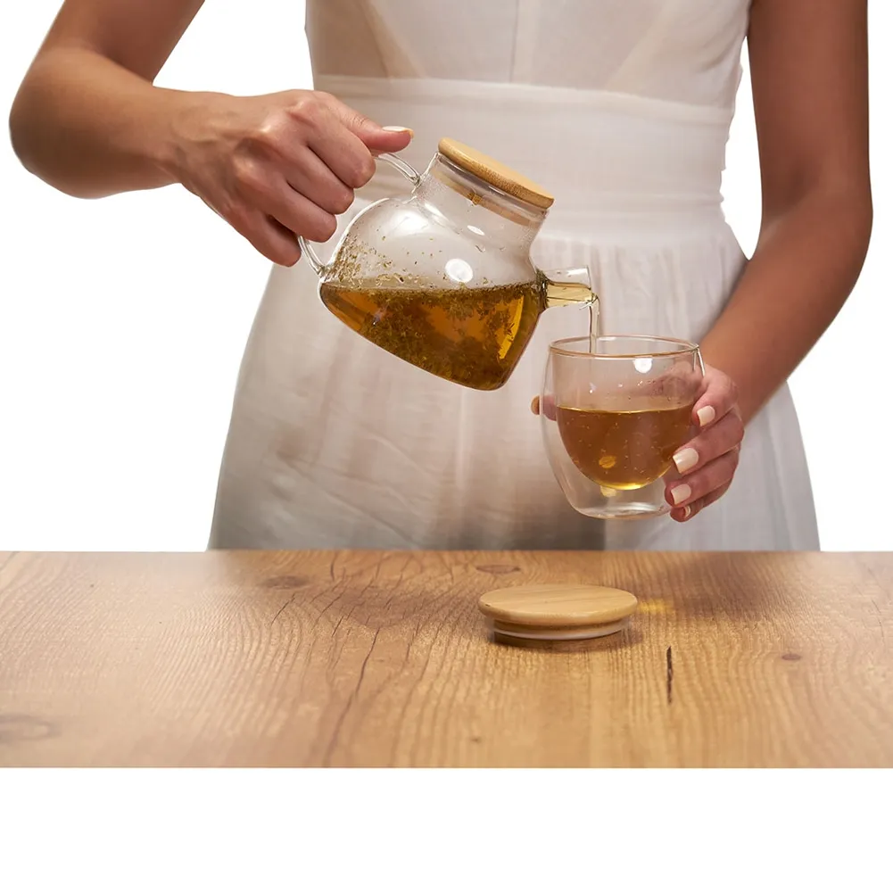 Conjunto contendo BULE de vidro de borossilicato* com infusor de aço inoxidável e tampa de Bambu com capacidade 850ml, e COPO também de vidro borossilicato* com parede dupla (mantém a temperatura do liquido por muito mais tempo) e tampa de Bambu, com capacidade 350ml. Borossilicato - Vidro com alta resistência ao calor. Pode ser colocado diretamente ao fogo (Bule pode ser aquecido diretamente na chama do fogão). Bule Diâmetro - 11cm Altura - 11cm Peso -0,275g Copo Diâmetro maior - 8cm Diâmetro menor - 5cm Altura - 9cm Peso - 172g
