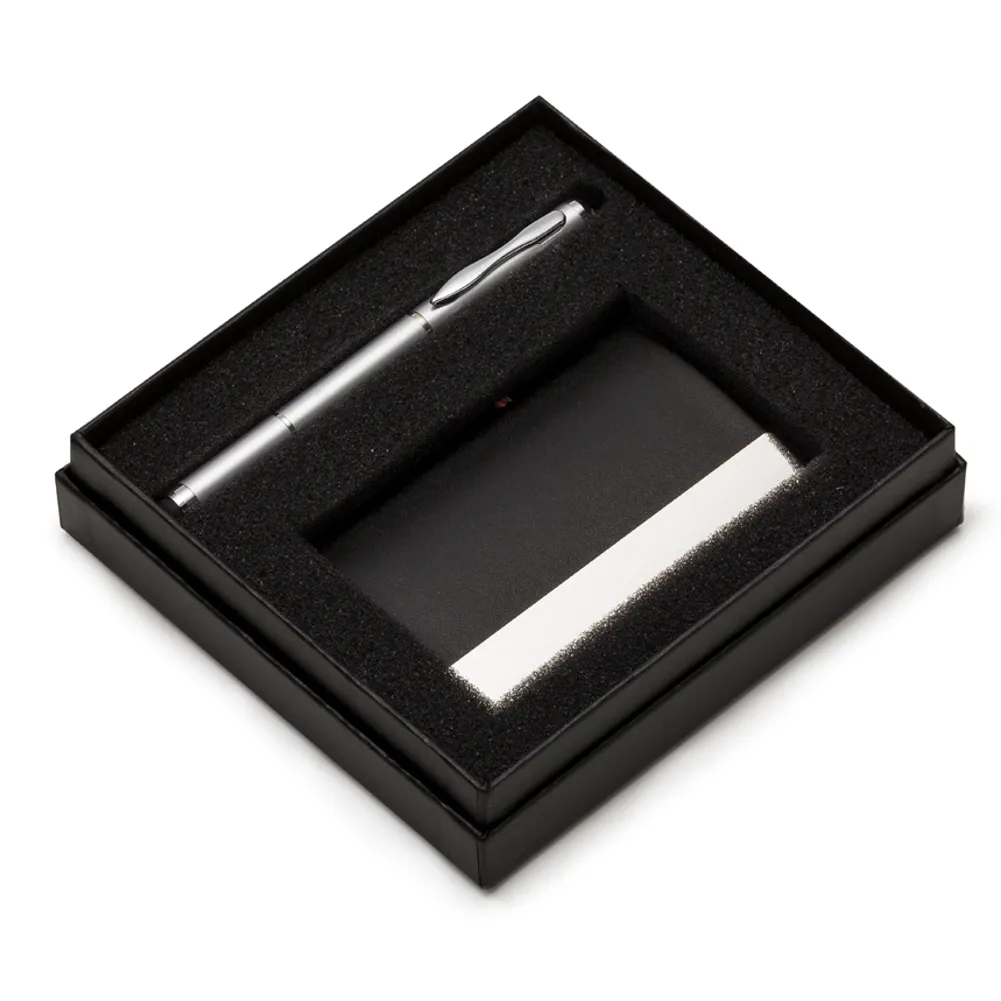 Kit executivo com 2 peças em estojo preto de papelão revestido com espuma interna. Possui uma caneta metal esfero laser e lanterna, clip metal e ao lado desenhos indicativos referente as funções, contém dois anéis prata, sendo o primeiro ao desrosquear fica o compartimento das baterias(acompanha 3 baterias CNB G3A) e o segundo anel é uma tampa com ponta touch, basta puxá-la para utilizar a caneta esfero. Porta cartão em couro sintético com detalhes em metal espelhado, parte interna revestida com veludo.