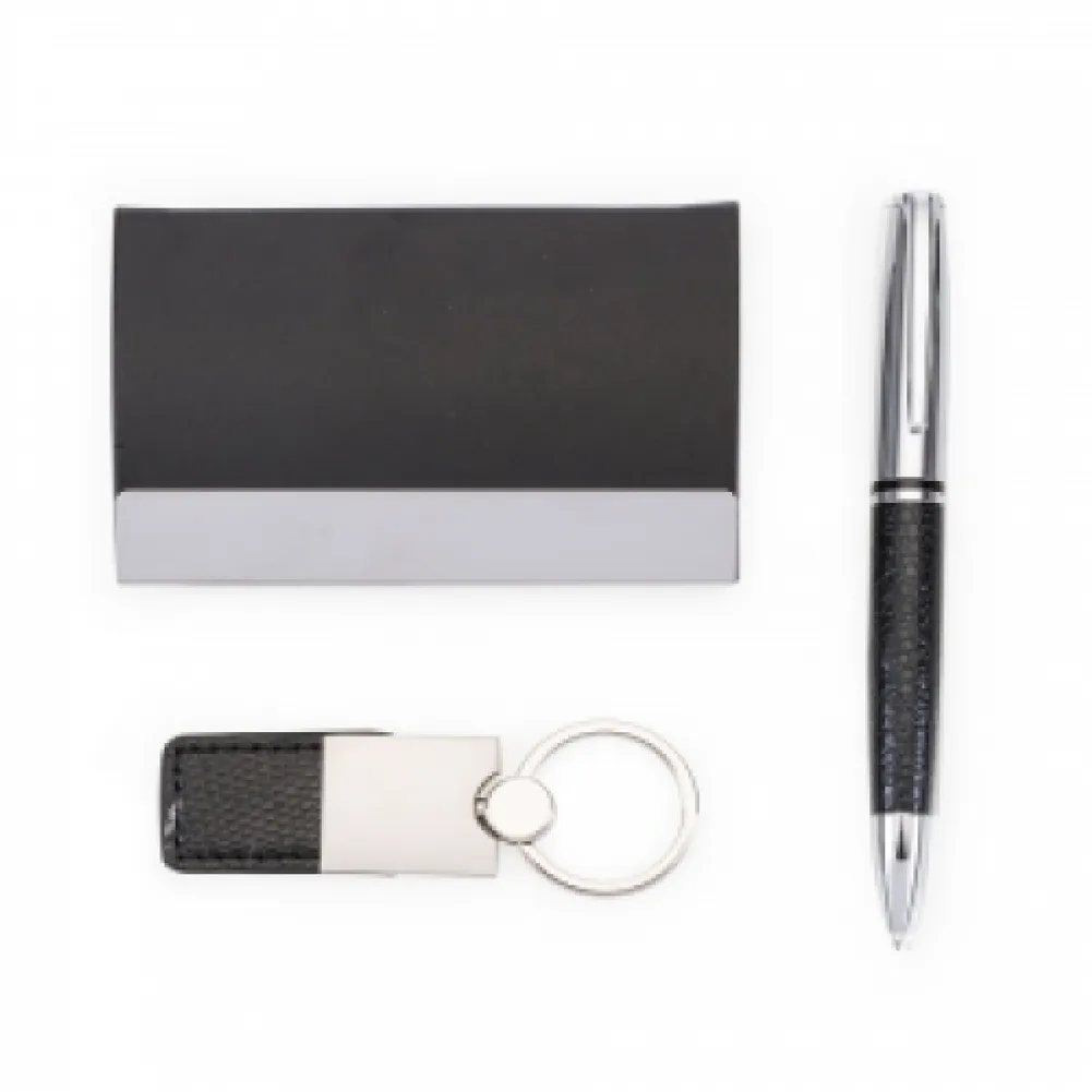 Kit executivo com 3 peças em estojo preto de papelão revestido com espuma interna. Possui: caneta metal brilhante com detalhe couro sintético preto, clip metal e anel central preto(aciona por giro); porta cartão em couro sintético liso com detalhes metálicos brilhantes(parte interna com veludo) fecha por imã; chaveiro metal fosco com detalhe inferior emborrachado(suporte da argola giratório brilhante).