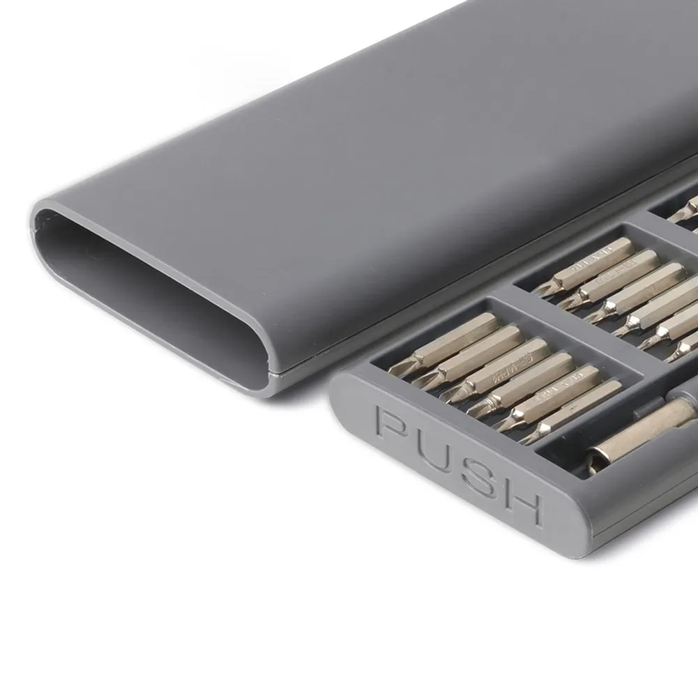 Kit ferramentas 25 peças em estojo de plástico ABS com abertura em clique. Acompanha: 5 ponteiras Philips, 1 ponteira Y, 6 ponteira Torx, 6 ponteira Allen, 5 ponteiras Fenda e 1 Fenda U em aço inox e chave para manuseio com encaixe imantado.