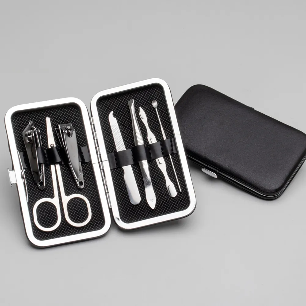 Kit manicure 7 peças em estojo de couro sintético. Possui: dois cortadores de unhas, tesoura, lixa, pinça, empurrador de cutícula e palito de unha. Parte interna de TNT com suporte de couro sintético para fixar as peças. Para abrir o estojo basta apertar o botão central.