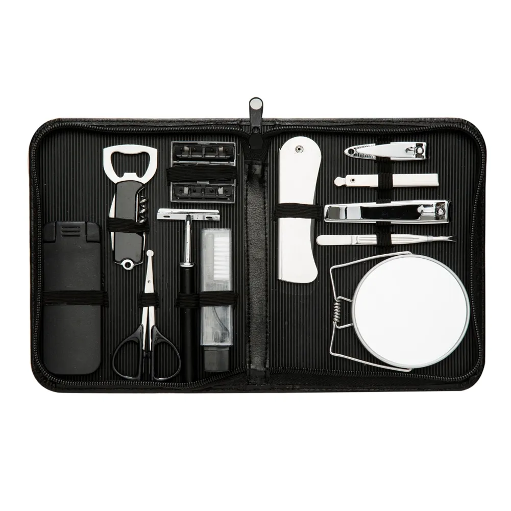 Kit masculino 12 peças em estojo de couro sintético, parte interna revestida com plástico em relevo e elástico para fixação dos itens. Possui: removedor de pelos, abridor saca rolha, tesoura, aparelho de barbear, lâminas para barba(3 unidades), escova de dente, pente, cortador de cutícula, mini kit unha 3 em 1(empurrador de cutícula, lixa, limpador de unha), cortador de unha, pinça e espelho duplo com aumento.
