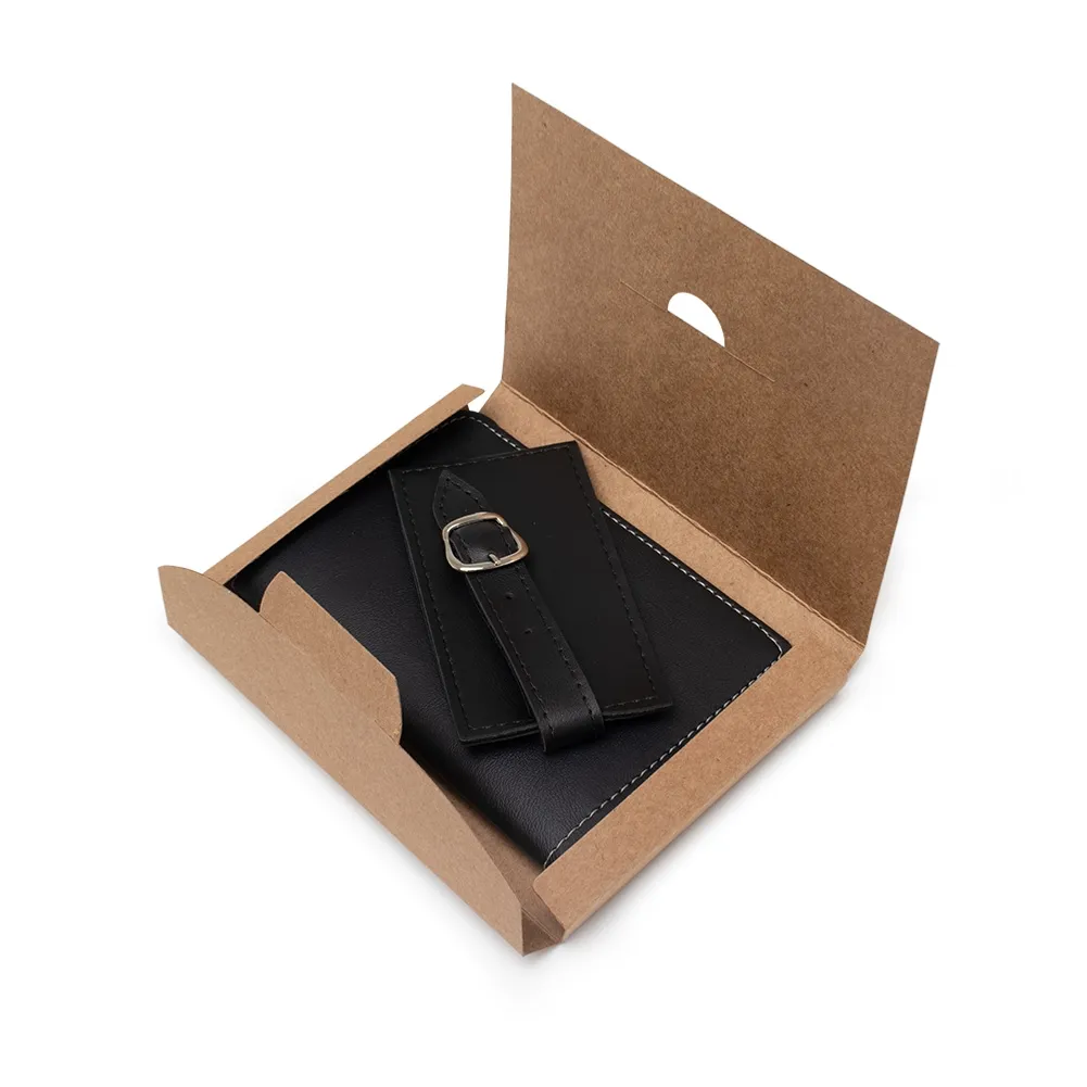 Kit Viagem 2 peças Bidins em couro sintético. Possui porta passaporte Porta com três divisórias para cartões e identificador de bagagem com fivela ajustável.