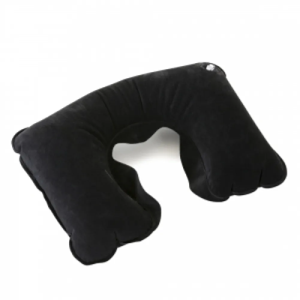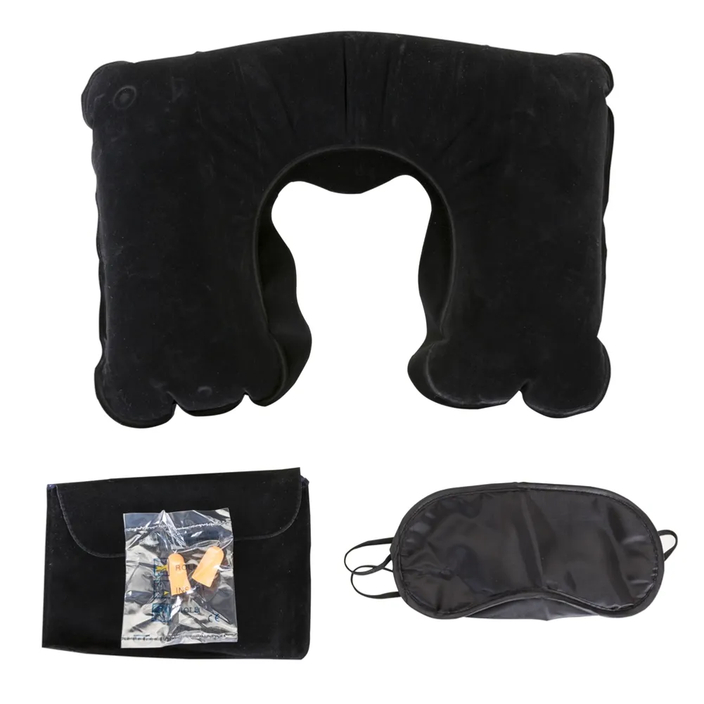 Kit viagem com 3 peças, contém: travesseiro inflável(revestido de veludo), máscara para olhos de cetim(revestido com espuma) e um par de protetor auricular. Travesseiro colorido, máscara sempre preta e protetor sempre laranja. Acompanha uma necessaire colorida de veludo para guardar o kit.