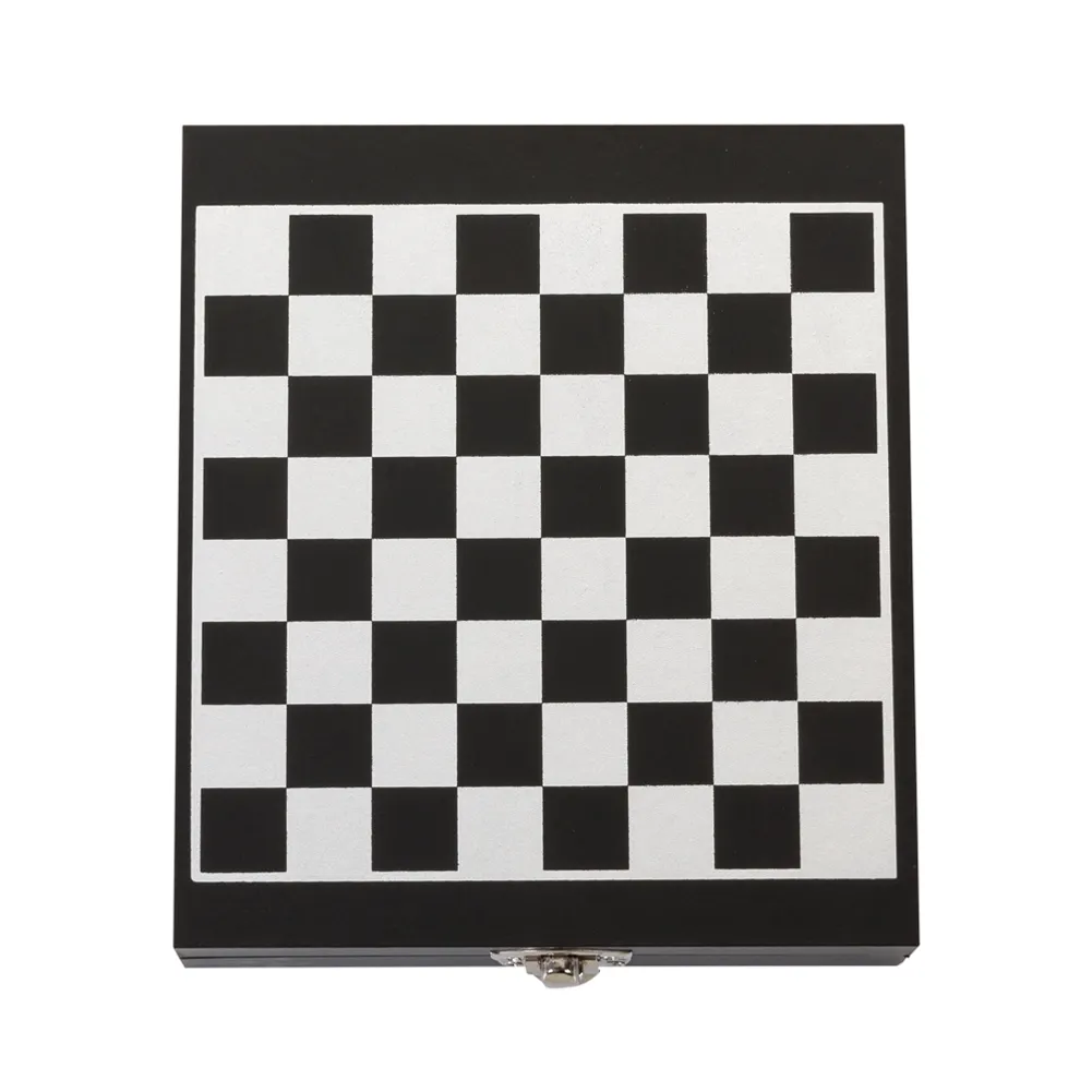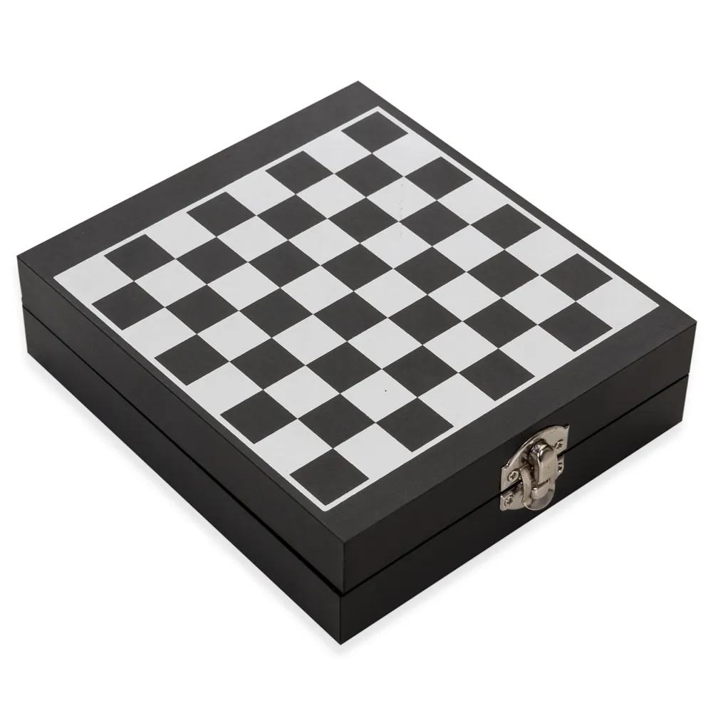 Kit vinho 4 peças em estojo tabuleiro de xadrez. Contém wine collar, tampa de bico, bico condutor com tampa e saca-rolhas metálico com lâmina de corte e abridor de garrafa. Estojo com trava de segurança e área interna com berço de espuma, acompanham 32 peças de xadrez e plaquinha metálica para personalização.