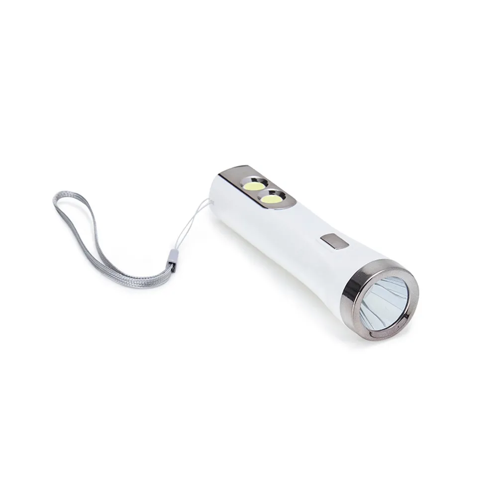 Lanterna plástica recarregável de um led com 3 estágios de iluminação e dois leds lateriais com função luminária. Possui cordão de nylon para transporte e acompanha cabo usb.