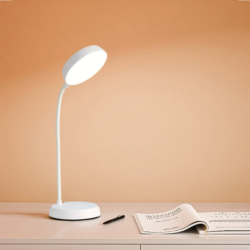Luminária articulável recarregável com 10 leds e funcionamento touch, material plástico. Contém três estágios de iluminação com regulagem de intensidade touch: luz fria (branca), luz quente (amarela) e luz mista (branca e amarela). Base com botão para ligar e desligar. Acompanha uma bateria de lítio e cabo USB para carregamento.